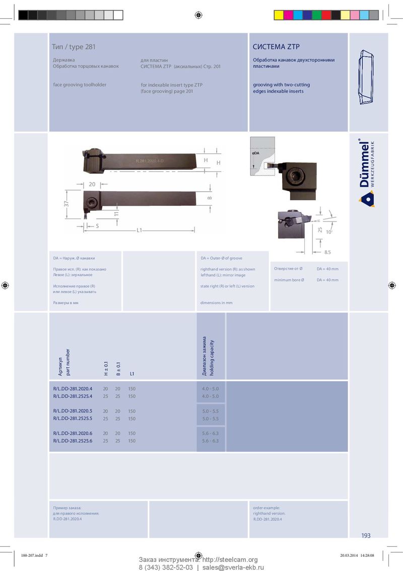Тип / type 281 СИСТЕМА ZTP Державка д л я п л а с т и н Обработка канавок двухсторонними Обработка торцовых канавок СИСТЕМА ZTP (аксиальных) Стр. 201 пластинами face grooving toolholder for indexable insert type ZTP grooving with two-cutting (face grooving) page 201 edges indexable inserts H H 20 B 37 11 S L1 25 10° 8.5 DA = Наруж. Ø канавки DA = Outer-Ø of groove Правое исп. (R): как показано righthand version (R): as shown Отверстие от Ø DA = 40 mm Левое (L): зеркальное lefthand (L): mirror image minimum bore Ø DA = 40 mm Исполнение правое (R) state right (R) or left (L) version или левое (L) указывать Размеры в мм dimensions in mm Артикул part number L1 H ± 0.1 B ± 0.1 Диапазон зажима holding capacity R/L.DD-281.2020.4 20 20 150 4.0 - 5.0 R/L.DD-281.2525.4 25 25 150 4.0 - 5.0 R/L.DD-281.2020.5 20 20 150 5.0 - 5.5 R/L.DD-281.2525.5 25 25 150 5.0 - 5.5 R/L.DD-281.2020.6 20 20 150 5.6 - 6.3 R/L.DD-281.2525.6 25 25 150 5.6 - 6.3 Пример заказа: order-example: для правого исполнения: righthand version: R.DD-281.2020.4 R.DD-281.2020.4 193 188-207.indd 7 188-207.indd 7 20.03.2014 14:28:08 20.03.2014 14:28:08 Заказ инструмента: http://steelcam.org 8 (343) 382-52-03 | sales@sverla-ekb.ru