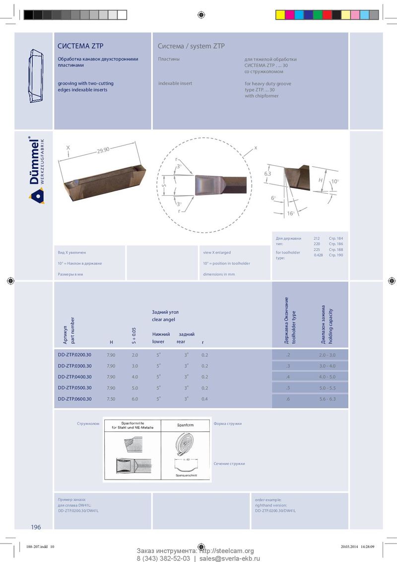СИСТЕМА ZTP Система / system ZTP Обработка канавок двухсторонними Пластины для тяжелой обработки пластинами СИСТЕМА ZTP . ... 30 со стружколомом grooving with two-cutting indexable insert for heavy duty groove edges indexable inserts type ZTP. ... 30 with chipformer X x 29.90 r 3° 6.3 H 10° S 6° 3° r 16° Для державки 212 Стр. 184 тип: 220 Стр. 186 225 Стр. 188 Вид Х увеличен view X enlarged for toolholder 0.428 Стр. 190 type: 10° = Наклон в державке 10° = position in toolholder Размеры в мм dimensions in mm Задний угол clear angel capacity Нижний задний Артикул part number H S + 0.05 lower rear r Державка Окончание toolholder type Диапазон зажима holding DD-ZTP.0200.30 7.90 2.0 5 ° 3 ° 0.2 .2 2.0 - 3.0 DD-ZTP.0300.30 7.90 3.0 5 ° 3 ° 0.2 .3 3.0 - 4.0 DD-ZTP.0400.30 7.90 4.0 5 ° 3 ° 0.2 .4 4.0 - 5.0 DD-ZTP.0500.30 7.90 5.0 5 ° 3 ° 0.2 .5 5.0 - 5.5 DD-ZTP.0600.30 7.50 6.0 5 ° 3 ° 0.4 .6 5.6 - 6.3 Стружколом Форма стружки Сечение стружки Пример заказа: order-example: для сплава DW41L: righthand version: DD-ZTP.0200.30/DW41L DD-ZTP.0200.30/DW41L 196 188-207.indd 10 188-207.indd 10 20.03.2014 14:28:09 20.03.2014 14:28:09 Заказ инструмента: http://steelcam.org 8 (343) 382-52-03 | sales@sverla-ekb.ru