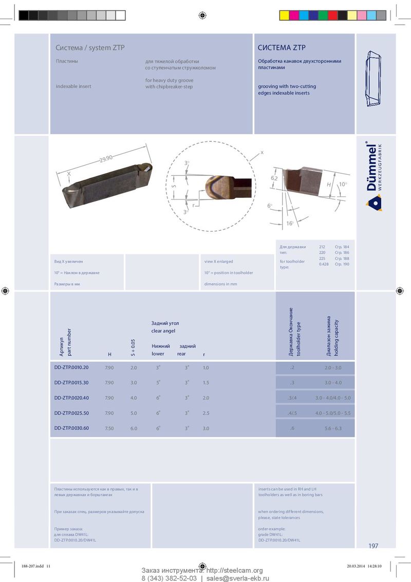 Система / system ZTP СИСТЕМА ZTP Пластины д л я т я ж е л о й о б р а б о т к и Обработка канавок двухсторонними со ступенчатым стружколомом пластинами for heavy duty groove indexable insert with chipbreaker-step grooving with two-cutting edges indexable inserts x 29.90 3° X 6.2 H 10° S r 6° 3° 16° Для державки 212 Стр. 184 тип: 220 Стр. 186 225 Стр. 188 Вид Х увеличен view X enlarged for toolholder 0.428 Стр. 190 type: 10° = Наклон в державке 10° = position in toolholder Размеры в мм dimensions in mm Задний угол clear angel capacity Нижний задний Артикул part number H S + 0.05 lower rear r Державка Окончание toolholder type Диапазон зажима holding DD-ZTP.0010.20 7.90 2.0 3 ° 3 ° 1.0 .2 2.0 - 3.0 DD-ZTP.0015.30 7.90 3.0 5 ° 3 ° 1.5 .3 3.0 - 4.0 DD-ZTP.0020.40 7.90 4.0 6 ° 3 ° 2.0 .3/.4 3.0 - 4.0/4.0 - 5.0 DD-ZTP.0025.50 7.90 5.0 6 ° 3 ° 2.5 .4/.5 4.0 - 5.0/5.0 - 5.5 DD-ZTP.0030.60 7.50 6.0 6 ° 3 ° 3.0 .6 5.6 - 6.3 Пластины используются как в правых, так и в inserts can be used in RH and LH левых державках и борштангах toolholders as well as in boring bars При заказах спец. размеров указывайте допуска when ordering different dimensions, please, state tolerances Пример заказа: order-example: для сплава DW41L: grade DW41L: DD-ZTP.0010.20/DW41L DD-ZTP.0010.20/DW41L 197 188-207.indd 11 188-207.indd 11 20.03.2014 14:28:10 20.03.2014 14:28:10 Заказ инструмента: http://steelcam.org 8 (343) 382-52-03 | sales@sverla-ekb.ru