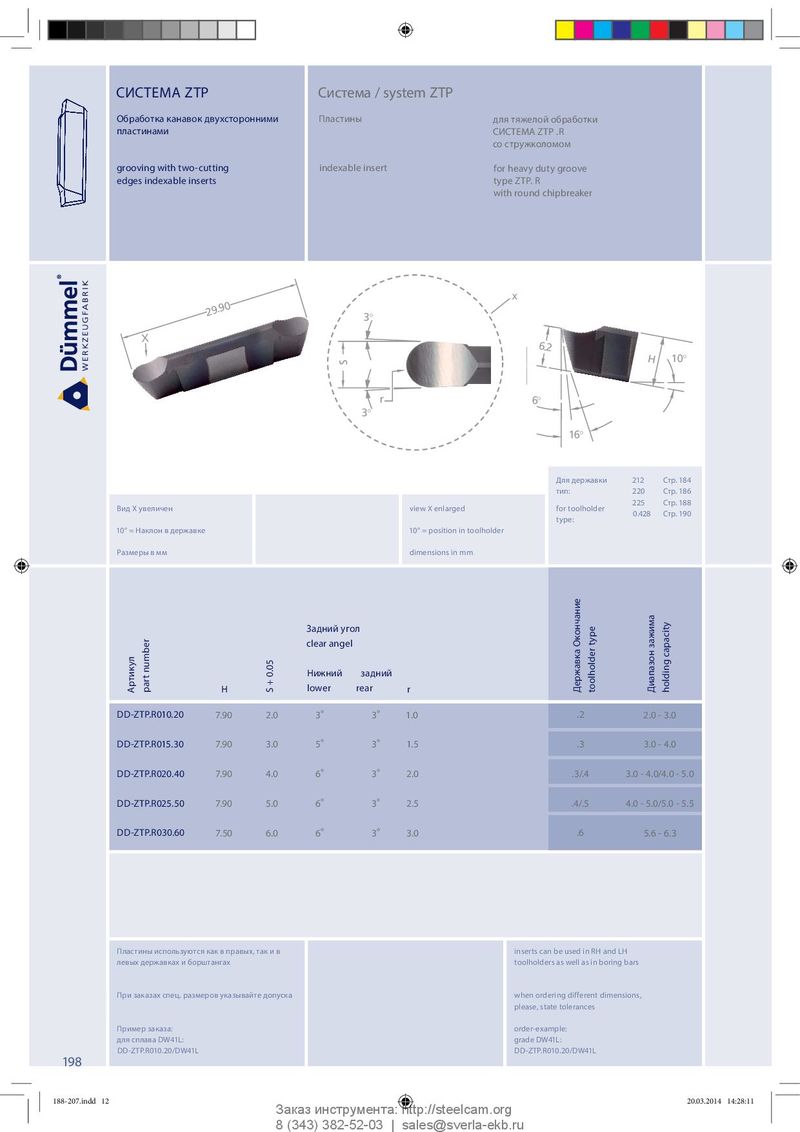 СИСТЕМА ZTP Система / system ZTP Обработка канавок двухсторонними Пластины д л я т я ж е л о й о б р а б о т к и пластинами СИСТЕМА ZTP .R со стружколомом grooving with two-cutting indexable insert for heavy duty groove edges indexable inserts type ZTP. R with round chipbreaker x 29.90 3° X 6.2 H 10° S r 6° 3° 16° Для державки 212 Стр. 184 тип: 220 Стр. 186 225 Стр. 188 Вид Х увеличен view X enlarged for toolholder 0.428 Стр. 190 type: 10° = Наклон в державке 10° = position in toolholder Размеры в мм dimensions in mm Задний угол clear angel capacity Нижний задний Артикул part number H S + 0.05 lower rear r Державка Окончание toolholder type Диапазон зажима holding DD-ZTP.R010.20 7.90 2.0 3 ° 3 ° 1.0 .2 2.0 - 3.0 DD-ZTP.R015.30 7.90 3.0 5 ° 3 ° 1.5 .3 3.0 - 4.0 DD-ZTP.R020.40 7.90 4.0 6 ° 3 ° 2.0 .3/.4 3.0 - 4.0/4.0 - 5.0 DD-ZTP.R025.50 7.90 5.0 6 ° 3 ° 2.5 .4/.5 4.0 - 5.0/5.0 - 5.5 DD-ZTP.R030.60 7.50 6.0 6 ° 3 ° 3.0 .6 5.6 - 6.3 Пластины используются как в правых, так и в inserts can be used in RH and LH левых державках и борштангах toolholders as well as in boring bars При заказах спец. размеров указывайте допуска when ordering different dimensions, please, state tolerances Пример заказа: order-example: для сплава DW41L: grade DW41L: DD-ZTP.R010.20/DW41L DD-ZTP.R010.20/DW41L 198 188-207.indd 12 188-207.indd 12 20.03.2014 14:28:11 20.03.2014 14:28:11 Заказ инструмента: http://steelcam.org 8 (343) 382-52-03 | sales@sverla-ekb.ru