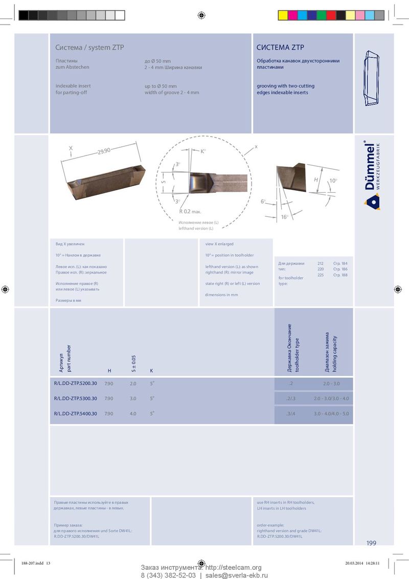 Система / system ZTP СИСТЕМА ZTP Пластины до Ø 50 mm Обработка канавок двухсторонними z u m A b s t e c h e n 2 - 4 mm Ширина канавки пластинами indexable insert up to Ø 50 mm grooving with two-cutting for parting-off width of groove 2 - 4 mm edges indexable inserts x X 29.90 K ° 3° H 10° S 3° 6° R 0.2 max. 16° Исполнение левое (L) lefthand version (L) Вид Х увеличен view X enlarged 10° = Наклон в державке 10° = position in toolholder Для державки 212 Стр. 184 Левое исп. (L): как показано lefthand version (L): as shown тип: 220 Стр. 186 Правое исп. (R): зеркальное righthand (R): mirror image 225 Стр. 188 for toolholder Исполнение правое (R) state right (R) or left (L) version type: или левое (L) указывать dimensions in mm Размеры в мм capacity Артикул part number H K S ± 0.05 Державка Окончание toolholder type Диапазон зажима holding R / L . D D -Z T P. 52 0 0 . 3 0 7.90 2.0 5 ° .2 2.0 - 3.0 R/L.DD-ZTP.5300.30 7.90 3.0 5 ° .2/.3 2.0 - 3.0/3.0 - 4.0 R/L.DD-ZTP.5400.30 7.90 4.0 5 ° .3/.4 3.0 - 4.0/4.0 - 5.0 Правые пластины используйте в правых use RH inserts in RH toolholders, державках, левые пластины - в левых. LH inserts in LH toolholders Пример заказа: order-example: для правого исполнения und Sorte DW41L: righthand version and grade DW41L: R.DD-ZTP.5200.30/DW41L R.DD-ZTP.5200.30/DW41L 199 188-207.indd 13 188-207.indd 13 20.03.2014 14:28:11 20.03.2014 14:28:11 Заказ инструмента: http://steelcam.org 8 (343) 382-52-03 | sales@sverla-ekb.ru