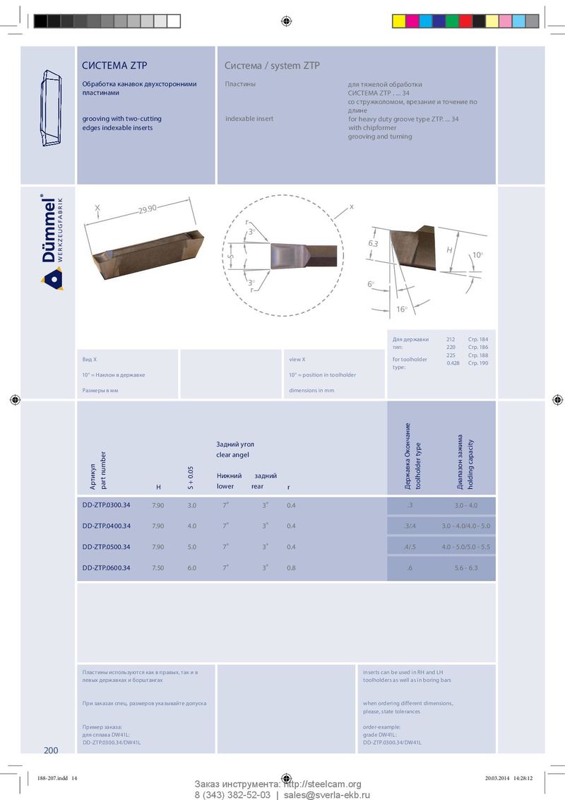 СИСТЕМА ZTP Система / system ZTP Обработка канавок двухсторонними Пластины для тяжелой обработки пластинами СИСТЕМА ZTP . ... 34 со стружколомом, врезание и точение по длине grooving with two-cutting indexable insert for heavy duty groove type ZTP. ... 34 edges indexable inserts with chipformer grooving and turning X x 29.90 r 3° 6.3 H S 10° 3° 6° r 16° Для державки 212 Стр. 184 тип: 220 Стр. 186 225 Стр. 188 Вид X view X for toolholder 0.428 Стр. 190 type: 10° = Наклон в державке 10° = position in toolholder Размеры в мм dimensions in mm Задний угол clear angel capacity Нижний задний Артикул part number H S + 0.05 lower rear r Державка Окончание toolholder type Диапазон зажима holding DD-ZTP.0300.34 7.90 3.0 7 ° 3 ° 0.4 .3 3.0 - 4.0 DD-ZTP.0400.34 7.90 4.0 7 ° 3 ° 0.4 .3/.4 3.0 - 4.0/4.0 - 5.0 DD-ZTP.0500.34 7.90 5.0 7 ° 3 ° 0.4 .4/.5 4.0 - 5.0/5.0 - 5.5 DD-ZTP.0600.34 7.50 6.0 7 ° 3 ° 0.8 .6 5.6 - 6.3 Пластины используются как в правых, так и в inserts can be used in RH and LH левых державках и борштангах toolholders as well as in boring bars При заказах спец. размеров указывайте допуска when ordering different dimensions, please, state tolerances Пример заказа: order-example: для сплава DW41L: grade DW41L: DD-ZTP.0300.34/DW41L DD-ZTP.0300.34/DW41L 200 188-207.indd 14 188-207.indd 14 20.03.2014 14:28:12 20.03.2014 14:28:12 Заказ инструмента: http://steelcam.org 8 (343) 382-52-03 | sales@sverla-ekb.ru