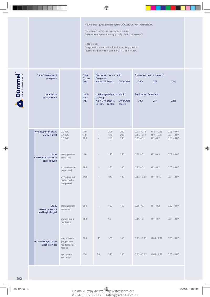 Режимы резания для обработки канавок Расчетные значения скорости в м/мин Диапазон подачи при внутр. обр. 0.01 - 0.08 мм/об cutting data for grooving standard values for cutting speeds feed rates grooving internal 0.01 - 0.08 mm/rev. Обрабатываемый Твер- Скорость. Vc = m/min Диапазон подач f мм/об материал Дость Покрытие (HB) K10F-DW DW41L DW4/DW5 DED ZTP ZSR material to hard- cutting speeds Vc = m/min feed rates f mm/rev. be machined ness coating (HB) K10F-DW DW41L DW4/DW5 DED ZTP ZSR uncoat. coated coated углеродистая сталь 0.2 % C 140 – 200 220 0.05 - 0.12 0.15 - 0.25 0.03 - 0.07 carbon steel 0.4 % C 180 – 180 200 0.05 - 0.12 0.15 - 0.25 0.03 - 0.07 0.6 % C 200 – 180 180 0.05 - 0.1 0.1 - 0.2 0.03 - 0.07 сталь отпущенная 180 – 180 180 0.05 - 0.1 0.1 - 0.2 0.03 - 0.07 низколегированная annealed steel alloyed улучшенная 280 – 150 140 0.05 - 0.1 0.1 - 0.2 0.03 - 0.07 quenched улучшенная 350 – 120 100 0.03 - 0.07 0.1 - 0.15 0.03 - 0.07 quenched + tempered Сталь отпущенная 200 – 160 140 0.05 - 0.1 0.1 - 0.2 0.03 - 0.07 высоколегиров. annealed steel high alloyed закаленная 200 50 0.05 - 0.1 0.1 - 0.2 0.03 - 0.07 hardened мартенсит./ 200 80 160 160 0.03 - 0.08 0.08 - 0.12 0.03 - 0.07 Нержавеющая сталь ферритная steel stainless martensitic/ ferritic аустенит./ 180 70 140 150 0.03 - 0.08 0.08 - 0.12 0.03 - 0.07 austenitic 202 188-207.indd 16 188-207.indd 16 20.03.2014 14:28:13 20.03.2014 14:28:13 Заказ инструмента: http://steelcam.org 8 (343) 382-52-03 | sales@sverla-ekb.ru