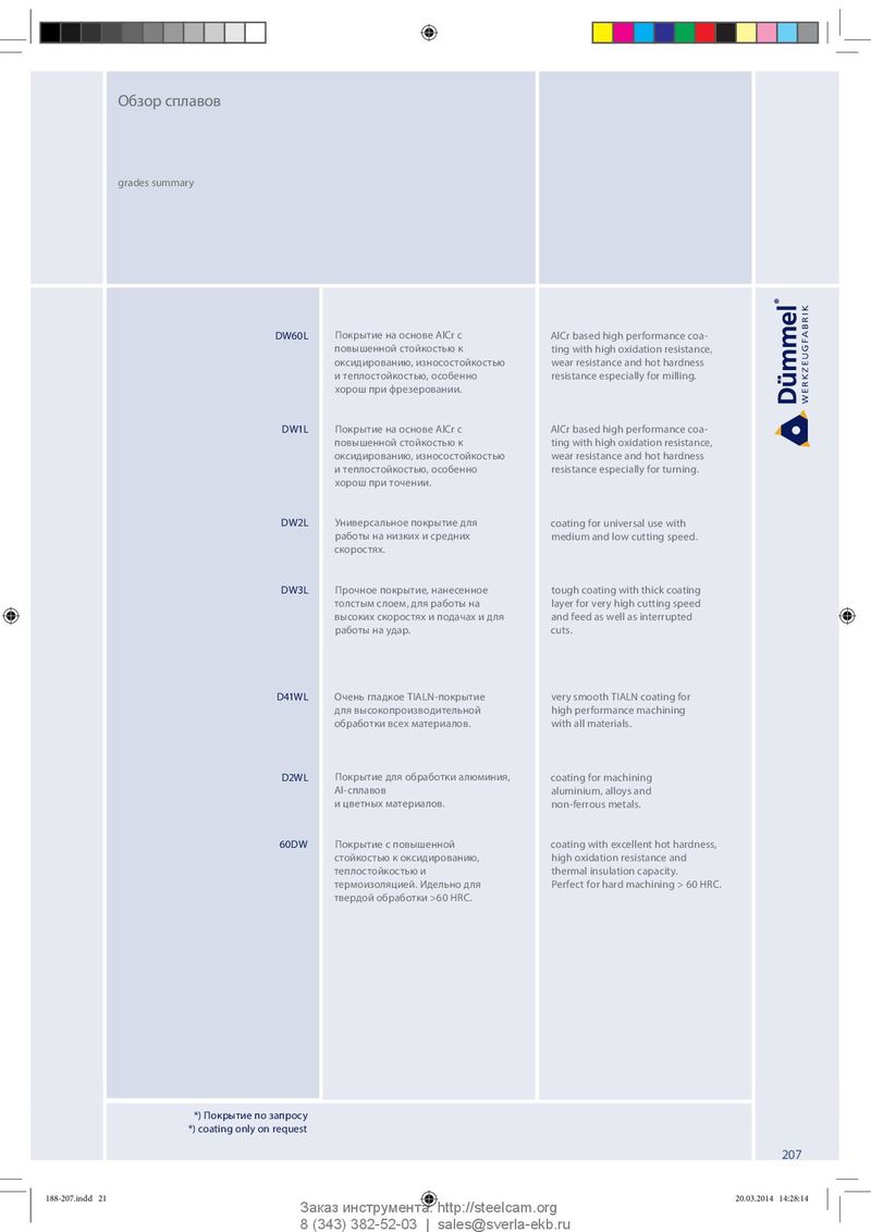 Обзор сплавов grades summary DW60L Покрытие на основе AlCr с AlCr based high performance coa- повышенной стойкостью к ting with high oxidation resistance, оксидированию, износостойкостью wear resistance and hot hardness и теплостойкостью, особенно resistance especially for milling. хорош при фрезеровании. DW1L Покрытие на основе AlCr с AlCr based high performance coa- повышенной стойкостью к ting with high oxidation resistance, оксидированию, износостойкостью wear resistance and hot hardness и теплостойкостью, особенно resistance especially for turning. хорош при точении. DW2L Универсальное покрытие для coating for universal use with работы на низких и средних medium and low cutting speed. скоростях. DW3L Прочное покрытие, нанесенное tough coating with thick coating толстым слоем, для работы на layer for very high cutting speed высоких скоростях и подачах и для and feed as well as interrupted работы на удар. cuts. D41WL Очень гладкое TIALN-покрытие very smooth TIALN coating for для высокопроизводительной high performance machining обработки всех материалов. with all materials. D2WL Покрытие для обработки алюминия, coating for machining Al-сплавов aluminium, alloys and и цветных материалов. non-ferrous metals. 60DW Покрытие с повышенной coating with excellent hot hardness, стойкостью к оксидированию, high oxidation resistance and теплостойкостью и thermal insulation capacity. термоизоляцией. Идельно для Perfect for hard machining > 60 HRC. твердой обработки >60 HRC. *) Покрытие по запросу *) coating only on request 207 188-207.indd 21 188-207.indd 21 20.03.2014 14:28:14 20.03.2014 14:28:14 Заказ инструмента: http://steelcam.org 8 (343) 382-52-03 | sales@sverla-ekb.ru