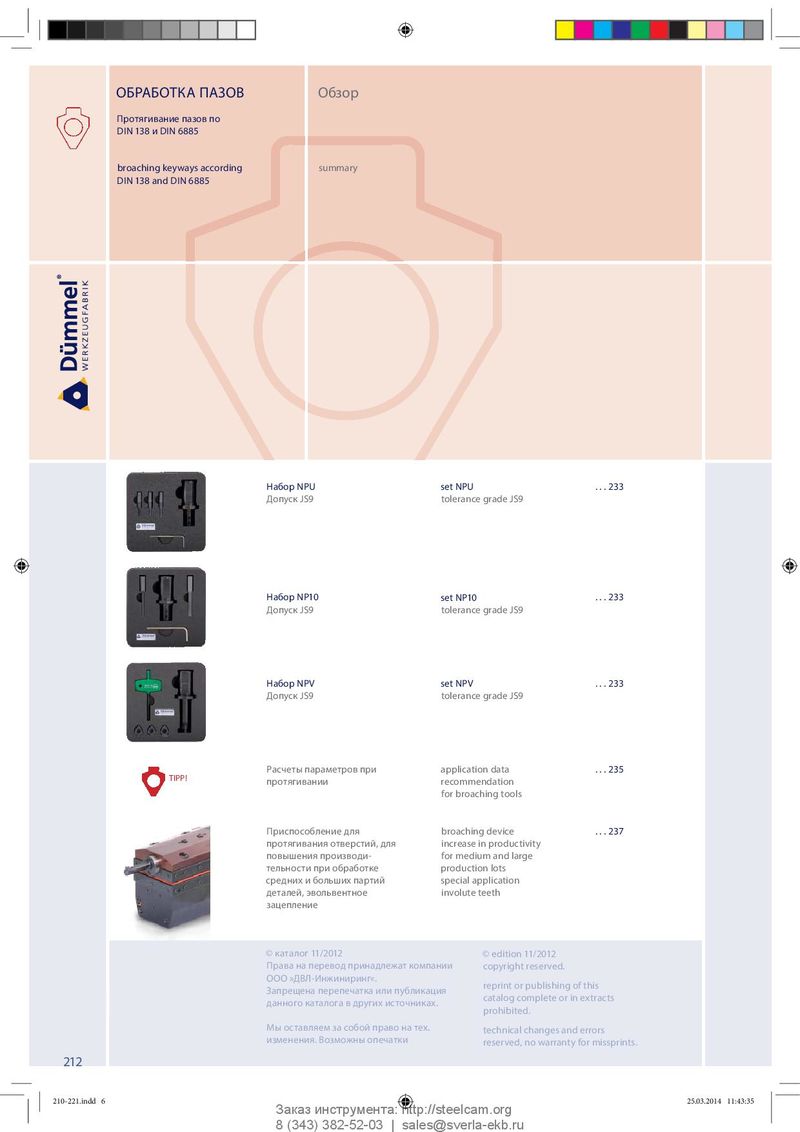 ОБРАБОТКА ПАЗОВ Обзор Протягивание пазов по DIN 138 и DIN 6885 broaching keyways according summary DIN 138 and DIN 6885 Набор NPU set NPU . . . 233 Допуск JS9 tolerance grade JS9 Набор NP10 set NP10 . . . 233 Допуск JS9 tolerance grade JS9 Набор NPV set NPV . . . 233 Допуск JS9 tolerance grade JS9 Расчеты параметров при application data . . . 235 TIPP! протягивании recommendation for broaching tools Приспособление для broaching device . . . 237 протягивания отверстий, для increase in productivity повышения производи- for medium and large тельности при обработке production lots средних и больших партий special application деталей, эвольвентное involute teeth зацепление © каталог 11/2012 © edition 11/2012 Права на перевод принадлежат компании copyright reserved. ООО »ДВЛ-Инжиниринг«. reprint or publishing of this Запрещена перепечатка или публикация catalog complete or in extracts данного каталога в других источниках. prohibited. Мы оставляем за собой право на тех. technical changes and errors изменения. Возможны опечатки reserved, no warranty for missprints. 212 210-221.indd 6 210-221.indd 6 25.03.2014 11:43:35 25.03.2014 11:43:35 Заказ инструмента: http://steelcam.org 8 (343) 382-52-03 | sales@sverla-ekb.ru