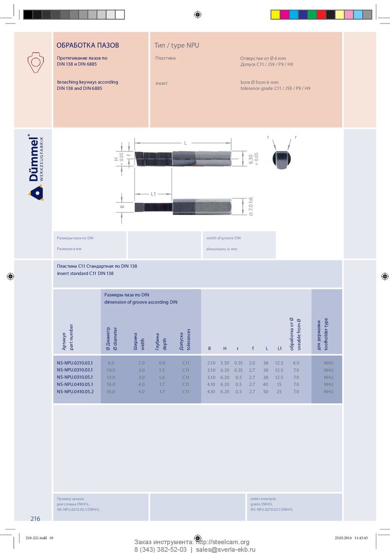 ОБРАБОТКА ПАЗОВ Тип / type NPU Протягивание пазов по Пластина Отверстие от Ø 6 mm DIN 138 и DIN 6885 Допуск C11 / JS9 / P9 / H9 broaching keyways according insert bore Ø from 6 mm DIN 138 and DIN 6885 tolerance grade C11 / JS9 / P9 / H9 r r L f H + 0.05 6.30 + 0.05 L1 B Ø 7.0 h6 Размеры паза по DIN width of groove DIN Размеры в мм dimensions in mm Пластина C11 Стандартная по DIN 138 insert standard C11 DIN 138 Размеры паза по DIN dimension of groove according DIN державки Артикул part number Ø Диаметр Ø diameter Ширина width Глубина depth Допуска tolerances B H r f L L1 обработка от Ø useable from Ø для toolholder type NS-NPU.0210.03.1 6.0 2.0 0.9 C11 2.10 5.50 0.35 2.0 38 12.5 6.0 NHU NS-NPU.0310.03.1 10.0 3.0 1.5 C11 3.10 6.20 0.35 2.7 38 12.5 7.0 NHU NS-NPU.0310.05.1 13.0 3.0 1.6 C11 3.10 6.20 0.5 2.7 38 12.5 7.0 NHU NS-NPU.0410.05.1 16.0 4.0 1.7 C11 4.10 6.20 0.5 2.7 40 15 7.0 NHU NS-NPU.0410.05.2 16.0 4.0 1.7 C11 4.10 6.20 0.5 2.7 50 25 7.0 NHU Пример заказа: order-example: для сплава DW41L: grade DW41L NS-NPU.0210.03.1/DW41L NS-NPU.0210.03.1/DW41L 216 210-221.indd 10 210-221.indd 10 25.03.2014 11:43:43 25.03.2014 11:43:43 Заказ инструмента: http://steelcam.org 8 (343) 382-52-03 | sales@sverla-ekb.ru