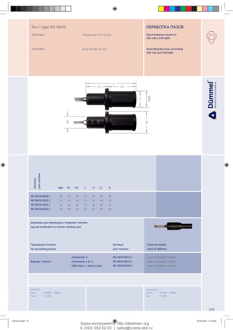 Тип / type NS-NH10 ОБРАБОТКА ПАЗОВ Державка Отверстие от Ø 10 mm Протягивание пазов по DIN 138 и DIN 6885 toolholder bore-Ø from 10 mm broaching keyways according DIN 138 and DIN 6885 L L1 L2 h d g6 d2 d1 Артикул part number dg6 d1 d2 L L1 L2 h NS-NH10.0020.1 20 33 20 73 33 40 18 NS-NH10.0022.1 22 33 20 73 33 40 20 NS-NH10.0025.1 25 33 20 73 33 40 23 NS-NH10.0032.1 32 40 20 73 33 40 30 Державка для приводных токарных головок special toolholder for driven slotting tool Приводная головка Артикул Срок поставки for broaching device part number time of delivery »Schwarzer 1« NS-NH10.0012.1 макс. 4 недели/ weeks Версия / version »Schwarzer 2 in 1« NS-NH10.0015.1 макс. 4 недели/ weeks »EWS Slot« + »Benz LinA« NS-NH10.0016.1 макс. 4 недели/ weeks Запчасти spare parts Винт 110.660 = M6x6 screw 110.660 = M6x6 К люч 111. 300 key 111. 300 219 210-221.indd 13 210-221.indd 13 25.03.2014 11:43:46 25.03.2014 11:43:46 Заказ инструмента: http://steelcam.org 8 (343) 382-52-03 | sales@sverla-ekb.ru