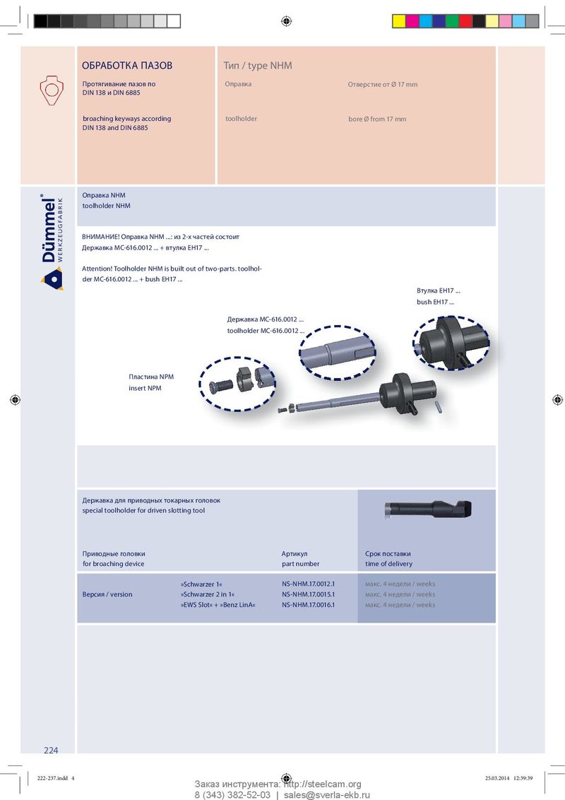 ОБРАБОТКА ПАЗОВ Тип / type NHM Протягивание пазов по Оправка Отверстие от Ø 17 mm DIN 138 и DIN 6885 broaching keyways according toolholder bore Ø from 17 mm DIN 138 and DIN 6885 Оправка NHM toolholder NHM ВНИМАНИЕ! Оправка NHM ...: из 2-х частей состоит Державка MC-616.0012 ... + втулка EH17 ... Attention! Toolholder NHM is built out of two-parts. toolhol- der MC-616.0012 ... + bush EH17 ... Втулка EH17 ... bush EH17 ... Державка MC-616.0012 ... toolholder MC-616.0012 ... Пластина NPM insert NPM Державка для приводных токарных головок special toolholder for driven slotting tool Приводные головки Артикул Срок поставки for broaching device part number time of delivery »Schwarzer 1« NS-NHM.17.0012.1 макс. 4 недели / weeks Версия / version »Schwarzer 2 in 1« NS-NHM.17.0015.1 макс. 4 недели / weeks »EWS Slot« + »Benz LinA« NS-NHM.17.0016.1 макс. 4 недели / weeks 224 222-237.indd 4 222-237.indd 4 25.03.2014 12:39:39 25.03.2014 12:39:39 Заказ инструмента: http://steelcam.org 8 (343) 382-52-03 | sales@sverla-ekb.ru