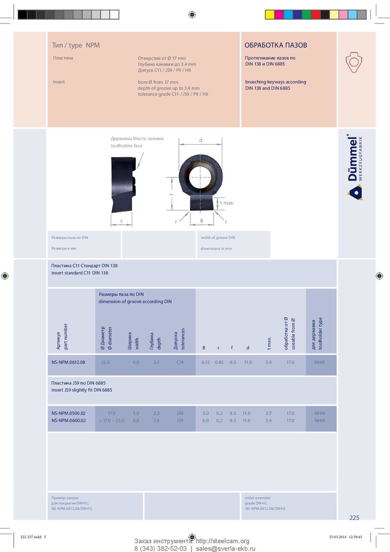 Тип / type NPM ОБРАБОТКА ПАЗОВ Пластина Отверстие от Ø 17 mm Протягивание пазов по Глубина канавки до 3.4 mm DIN 138 и DIN 6885 Допуск C11 / JS9 / P9 / H9 insert bore Ø from 17 mm broaching keyways according depth of groove up to 3.4 mm DIN 138 and DIN 6885 tolerance grade C11 / JS9 / P9 / H9 Державка Место зажима d Klemmhalter Stirnseite toolholder face toolholder face f t max. s r r B Размеры паза по DIN width of groove DIN Размеры в мм dimensions in mm Пластина C11 Стандарт DIN 138 insert standard C11 DIN 138 Размеры паза по DIN dimension of groove according DIN державки Артикул part number Ø Диаметр Ø diameter Ширина width Глубина depth Допуска tolerances B r f d t max. обработка от Ø useable from Ø для toolholder type NS-NPM.0612.08 22.0 6.0 2.1 C11 6.12 0.85 8.5 11.0 3.4 17.0 NHM Пластина JS9 по DIN 6885 insert JS9 slightly fit DIN 6885 NS-NPM.0500.02 17.0 5.0 2.3 JS9 5.0 0.2 8.5 11.0 2.7 17.0 NHM NS-NPM.0600.02 > 17.0 – 22.0 6.0 2.8 JS9 6.0 0.2 8.5 11.0 3.4 17.0 NHM Пример заказа: order-example: для покрытия DW41L: grade DW41L NS-NPM.0612.08/DW41L NS-NPM.0612.08/DW41L 225 222-237.indd 5 222-237.indd 5 25.03.2014 12:39:43 25.03.2014 12:39:43 Заказ инструмента: http://steelcam.org 8 (343) 382-52-03 | sales@sverla-ekb.ru