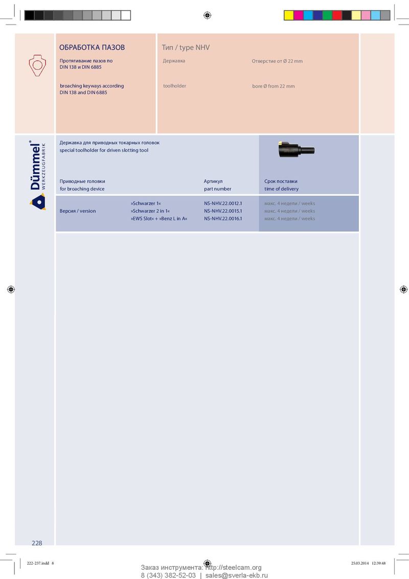 ОБРАБОТКА ПАЗОВ Тип / type NHV Протягивание пазов по Державка Отверстие от Ø 22 mm DIN 138 и DIN 6885 broaching keyways according toolholder bore Ø from 22 mm DIN 138 and DIN 6885 Державка для приводных токарных головок special toolholder for driven slotting tool Приводные головки Артикул Срок поставки for broaching device part number time of delivery »Schwarzer 1« NS-NHV.22.0012.1 макс. 4 недели / weeks Версия / version »Schwarzer 2 in 1« NS-NHV.22.0015.1 макс. 4 недели / weeks »EWS Slot« + »Benz L in A« NS-NHV.22.0016.1 макс. 4 недели / weeks 228 222-237.indd 8 222-237.indd 8 25.03.2014 12:39:48 25.03.2014 12:39:48 Заказ инструмента: http://steelcam.org 8 (343) 382-52-03 | sales@sverla-ekb.ru