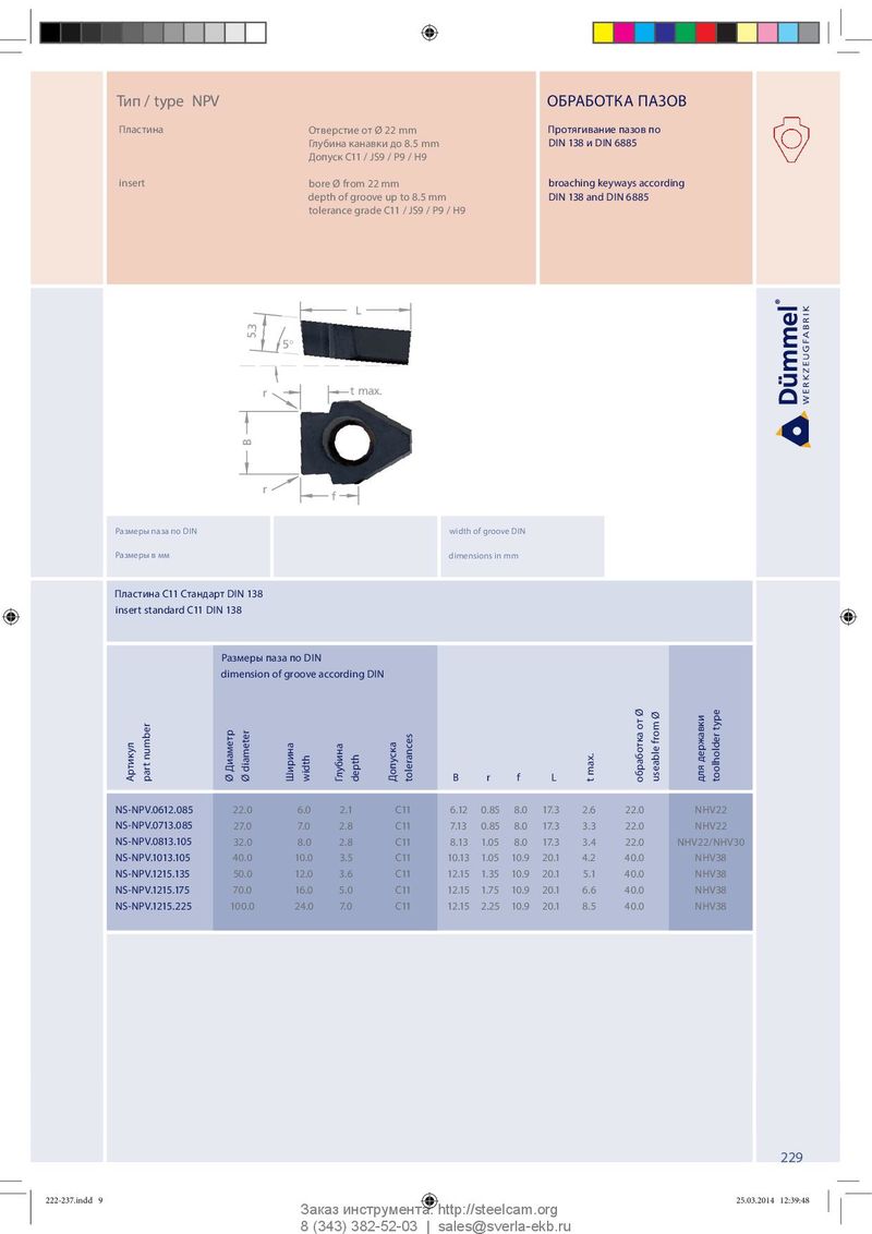 Тип / type NPV ОБРАБОТКА ПАЗОВ Пластина Отверстие от Ø 22 mm Протягивание пазов по Глубина канавки до 8.5 mm DIN 138 и DIN 6885 Допуск C11 / JS9 / P9 / H9 insert bore Ø from 22 mm broaching keyways according depth of groove up to 8.5 mm DIN 138 and DIN 6885 tolerance grade C11 / JS9 / P9 / H9 L 5.3 5° r t max. B r f Размеры паза по DIN width of groove DIN Размеры в мм dimensions in mm Пластина C11 Стандарт DIN 138 insert standard C11 DIN 138 Размеры паза по DIN dimension of groove according DIN державки Артикул part number Ø Диаметр Ø diameter Ширина width Глубина depth Допуска tolerances B r f L t max. обработка от Ø useable from Ø для toolholder type NS-NPV.0612.085 22.0 6.0 2.1 C11 6.12 0.85 8.0 17.3 2.6 22.0 NHV22 NS-NPV.0713.085 27.0 7.0 2.8 C11 7.13 0.85 8.0 17.3 3.3 22.0 NHV22 NS-NPV.0813.105 32.0 8.0 2.8 C11 8.13 1.05 8.0 17.3 3.4 22.0 NHV22/NHV30 NS-NPV.1013.105 40.0 10.0 3.5 C11 10.13 1.05 10.9 20.1 4.2 40.0 NHV38 NS-NPV.1215.135 50.0 12.0 3.6 C11 12.15 1.35 10.9 20.1 5.1 40.0 NHV38 NS-NPV.1215.175 70.0 16.0 5.0 C11 12.15 1.75 10.9 20.1 6.6 40.0 NHV38 NS-NPV.1215.225 100.0 24.0 7.0 C11 12.15 2.25 10.9 20.1 8.5 40.0 NHV38 229 222-237.indd 9 222-237.indd 9 25.03.2014 12:39:48 25.03.2014 12:39:48 Заказ инструмента: http://steelcam.org 8 (343) 382-52-03 | sales@sverla-ekb.ru