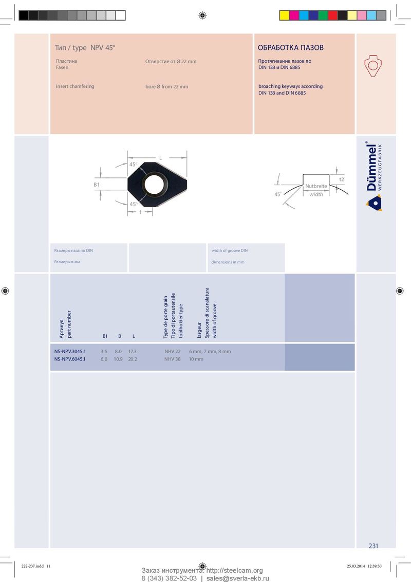 Тип / type NPV 45° ОБРАБОТКА ПАЗОВ Пластина Отверстие от Ø 22 mm Протягивание пазов по Fasen DIN 138 и DIN 6885 insert chamfering bore Ø from 22 mm broaching keyways according DIN 138 and DIN 6885 L 45° t2 B1 Nutbreite 45 ° width 45° f Размеры паза по DIN width of groove DIN Размеры в мм dimensions in mm Артикул part number B1 B L Type de porte grain Tipo di portautensile toolholder type largeur Spessore di scanalatura width of groove NS-NPV.3045.1 3.5 8.0 17.3 NHV 22 6 mm, 7 mm, 8 mm NS-NPV.6045.1 6.0 10.9 20.2 NHV 38 10 mm 231 222-237.indd 11 222-237.indd 11 25.03.2014 12:39:50 25.03.2014 12:39:50 Заказ инструмента: http://steelcam.org 8 (343) 382-52-03 | sales@sverla-ekb.ru