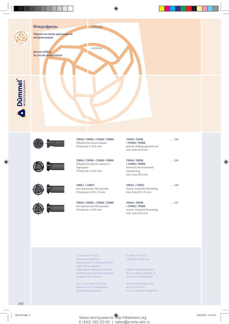 Микрофрезы Обзор Обработка пазов циркулярной интерполяцией summary groove milling by circular interpolation DWA6 / DWB6 + DWA8 / DWB8 DWA6 / DWB6 . . . 242 Обработка пазов общая + DWA8 / DWB8 Отвертие от Ø 6 mm groove milling general use min. bore Ø 6 mm DWA6 / DWB6 + DWA8 / DWB8 DWA6 / DWB6 . . . 244 Обработка фасок задних и + DWA8 / DWB8 передних forward and backward Отвертие от Ø 6 mm chamfering min. bore Ø 6 mm DWA3 + DWA5 DWA3 + DWA5 . . . 246 метчрическая ISO-резьба metric standard threading Отвертие от Ø 1.25 mm min. bore Ø 1.25 mm DWA6 / DWB6 + DWA8 / DWB8 DWA6 / DWB6 . . . 247 метчрическая ISO-резьба + DWA8 / DWB8 Отвертие от Ø 6 mm metric standard threading min. bore Ø 6 mm © каталог 11/2012 © edition 11/2012 Права на перевод copyright reserved. принадлежат компании ООО »ДВЛ-Инжиниринг«. Запрещена перепечатка или reprint or publishing of публикация данного каталога this catalog complete or в других источниках. in extracts prohibited. Мы оставляем за собой technical changes and право на тех. изменения. errors reserved, Возможны опечатки no warranty for missprints. 240 240-247.indd 4 240-247.indd 4 25.03.2014 13:14:55 25.03.2014 13:14:55 Заказ инструмента: http://steelcam.org 8 (343) 382-52-03 | sales@sverla-ekb.ru