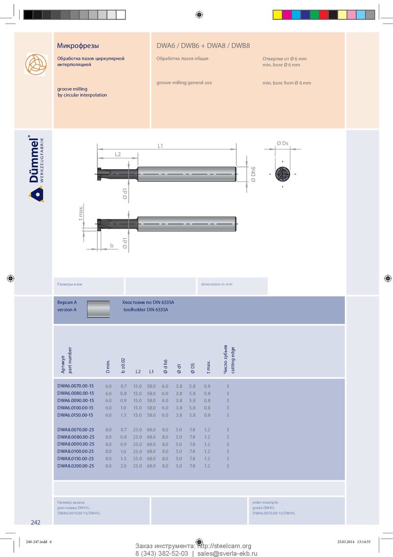 Микрофрезы DWA6 / DWB6 + DWA8 / DWB8 Обработка пазов циркулярной Обработка пазов общая Отвертие от Ø 6 mm интерполяцией min. bore Ø 6 mm groove milling general use min. bore from Ø 6 mm groove milling by circular interpolation Ø Ds L1 L2 Ø Dh6 Ø d1 t max. b Ø d1 Размеры в мм dimensions in mm Версия A Хвостовик по DIN 6535A version A toolholder DIN 6535A Артикул part number D min. L2 L1 b ±0.02 Ø d h6 Ø d1 Ø DS t max. Число зубьев cutting edge DWA6.0070.00-15 6.0 0.7 15.0 58.0 6.0 3.8 5.8 0.8 3 DWA6.0080.00-15 6.0 0.8 15.0 58.0 6.0 3.8 5.8 0.8 3 DWA6.0090.00-15 6.0 0.9 15.0 58.0 6.0 3.8 5.8 0.8 3 DWA6.0100.00-15 6.0 1.0 15.0 58.0 6.0 3.8 5.8 0.8 3 DWA6.0150.00-15 6.0 1.5 15.0 58.0 6.0 3.8 5.8 0.8 3 DWA8.0070.00-25 8.0 0.7 25.0 68.0 8.0 5.0 7.8 1.2 3 DWA8.0080.00-25 8.0 0.8 25.0 68.0 8.0 5.0 7.8 1.2 3 DWA8.0090.00-25 8.0 0.9 25.0 68.0 8.0 5.0 7.8 1.2 3 DWA8.0100.00-25 8.0 1.0 25.0 68.0 8.0 5.0 7.8 1.2 3 DWA8.0150.00-25 8.0 1.5 25.0 68.0 8.0 5.0 7.8 1.2 3 DWA8.0200.00-25 8.0 2.0 25.0 68.0 8.0 5.0 7.8 1.2 3 Пример заказа: order-example: для сплава DW41L: grade DW41L DWA6.0070.00-15/DW41L DWA6.0070.00-15/DW41L 242 240-247.indd 6 240-247.indd 6 25.03.2014 13:14:55 25.03.2014 13:14:55 Заказ инструмента: http://steelcam.org 8 (343) 382-52-03 | sales@sverla-ekb.ru
