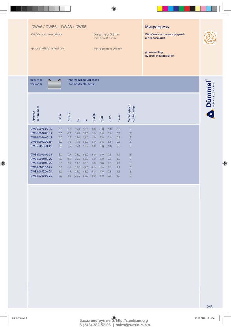 DWA6 / DWB6 + DWA8 / DWB8 Микрофрезы Обработка пазов общая Отвертие от Ø 6 mm Обработка пазов циркулярной min. bore Ø 6 mm интерполяцией groove milling general use min. bore from Ø 6 mm groove milling by circular interpolation Версия B Хвостовик по DIN 6535B version B toolholder DIN 6535B Артикул part number D min. L2 L1 b ±0.02 Ø d h6 Ø d1 Ø DS t max. Число зубьев cutting edge DWB6.0070.00-15 6.0 0.7 15.0 58.0 6.0 3.8 5.8 0.8 3 DWB6.0080.00-15 6.0 0.8 15.0 58.0 6.0 3.8 5.8 0.8 3 DWB6.0090.00-15 6.0 0.9 15.0 58.0 6.0 3.8 5.8 0.8 3 DWB6.0100.00-15 6.0 1.0 15.0 58.0 6.0 3.8 5.8 0.8 3 DWB6.0150.00-15 6.0 1.5 15.0 58.0 6.0 3.8 5.8 0.8 3 DWB8.0070.00-25 8.0 0.7 25.0 68.0 8.0 5.0 7.8 1.2 3 DWB8.0080.00-25 8.0 0.8 25.0 68.0 8.0 5.0 7.8 1.2 3 DWB8.0090.00-25 8.0 0.9 25.0 68.0 8.0 5.0 7.8 1.2 3 DWB8.0100.00-25 8.0 1.0 25.0 68.0 8.0 5.0 7.8 1.2 3 DWB8.0150.00-25 8.0 1.5 25.0 68.0 8.0 5.0 7.8 1.2 3 DWB8.0200.00-25 8.0 2.0 25.0 68.0 8.0 5.0 7.8 1.2 3 243 240-247.indd 7 240-247.indd 7 25.03.2014 13:14:56 25.03.2014 13:14:56 Заказ инструмента: http://steelcam.org 8 (343) 382-52-03 | sales@sverla-ekb.ru