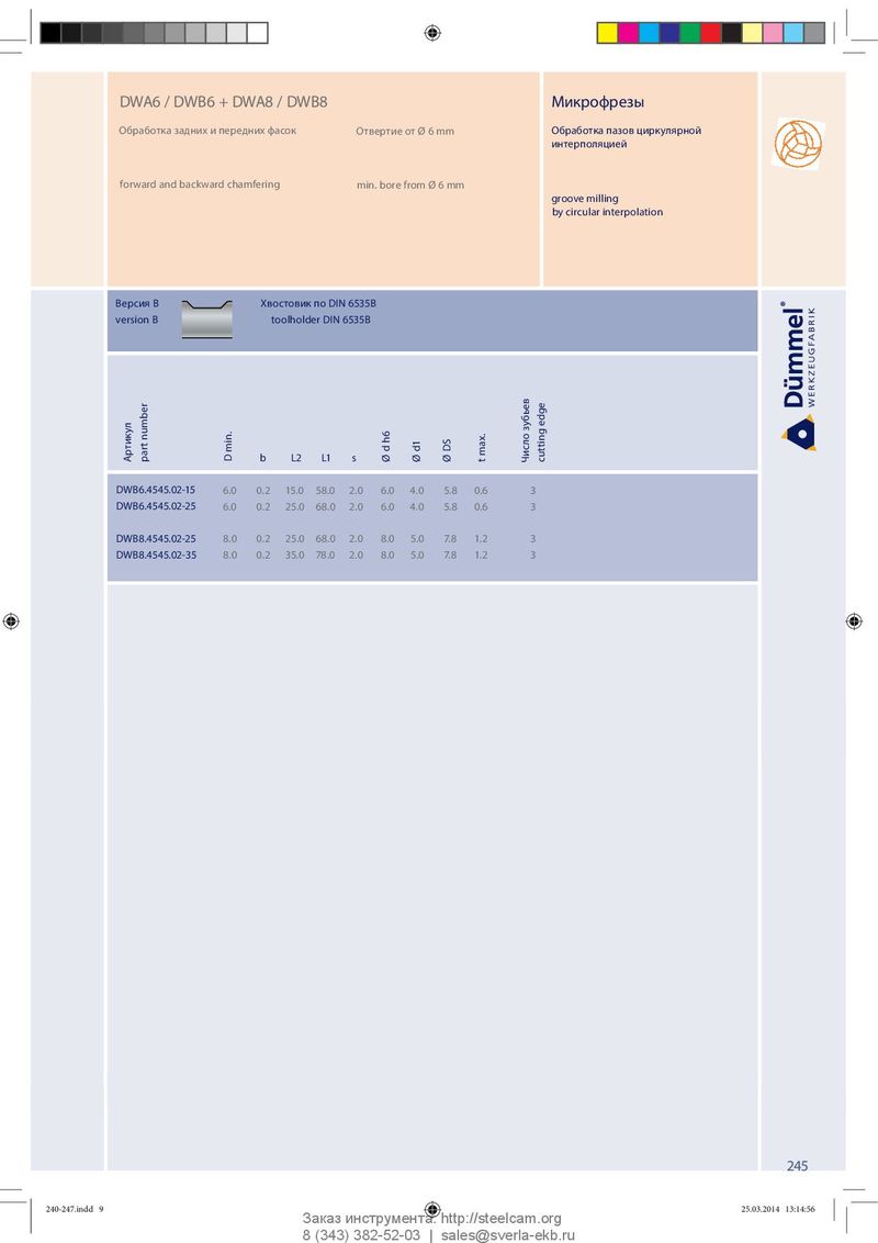DWA6 / DWB6 + DWA8 / DWB8 Микрофрезы Обработка задних и передних фасок Отвертие от Ø 6 mm Обработка пазов циркулярной интерполяцией forward and backward chamfering min. bore from Ø 6 mm groove milling by circular interpolation Версия B Хвостовик по DIN 6535B version B toolholder DIN 6535B Артикул part number b L2 L1 s D min. Ø d h6 Ø d1 Ø DS t max. Число зубьев cutting edge DWB6.4545.02-15 6.0 0.2 15.0 58.0 2.0 6.0 4.0 5.8 0.6 3 DWB6.4545.02-25 6.0 0.2 25.0 68.0 2.0 6.0 4.0 5.8 0.6 3 DWB8.4545.02-25 8.0 0.2 25.0 68.0 2.0 8.0 5.0 7.8 1.2 3 DWB8.4545.02-35 8.0 0.2 35.0 78.0 2.0 8.0 5.0 7.8 1.2 3 245 240-247.indd 9 240-247.indd 9 25.03.2014 13:14:56 25.03.2014 13:14:56 Заказ инструмента: http://steelcam.org 8 (343) 382-52-03 | sales@sverla-ekb.ru