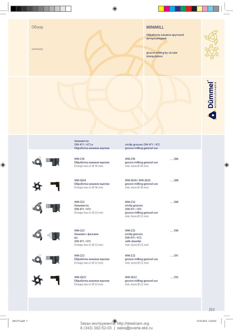 Обзор MINIMILL Обработка канавок круговой интерполяцией summary groove milling by circular interpolation Канавки по DIN 471 / 472 и circlip grooves DIN 471 / 472 Обработка канавок вцелом groove milling general use MM-Z18 MM-Z18 . . . 286 Обработка канавок вцелом groove milling general use Отверстие от Ø 18 mm min. bore Ø 18 mm MM-Z618 MM-Z618 / MM-Z620 . . . 288 Обработка канавок вцелом groove milling general use Отверстие от Ø 18 mm min. bore Ø 18 mm MM-Z22 MM-Z22 . . . 288 Канавки по circlip grooves DIN 471 / 472 DIN 471 / 472 Отверстие от Ø 22 mm groove milling general use min. bore Ø 22 mm MM-Z22 MM-Z22 . . . 290 Канавки с фасками circlip grooves по DIN 471 / 472 DIN 471 / 472 with chamfer Отверстие от Ø 22 mm min. bore Ø 22 mm MM-Z22 MM-Z22 . . . 291 Обработка канавок вцелом groove milling general use Отверстие от Ø 22 mm min. bore Ø 22 mm MM-Z622 MM-Z622 . . . 292 Обработка канавок вцелом groove milling general use Отверстие от Ø 22 mm min. bore Ø 22 mm 253 250-277.indd 7 250-277.indd 7 27.03.2014 13:28:43 27.03.2014 13:28:43 Заказ инструмента: http://steelcam.org 8 (343) 382-52-03 | sales@sverla-ekb.ru
