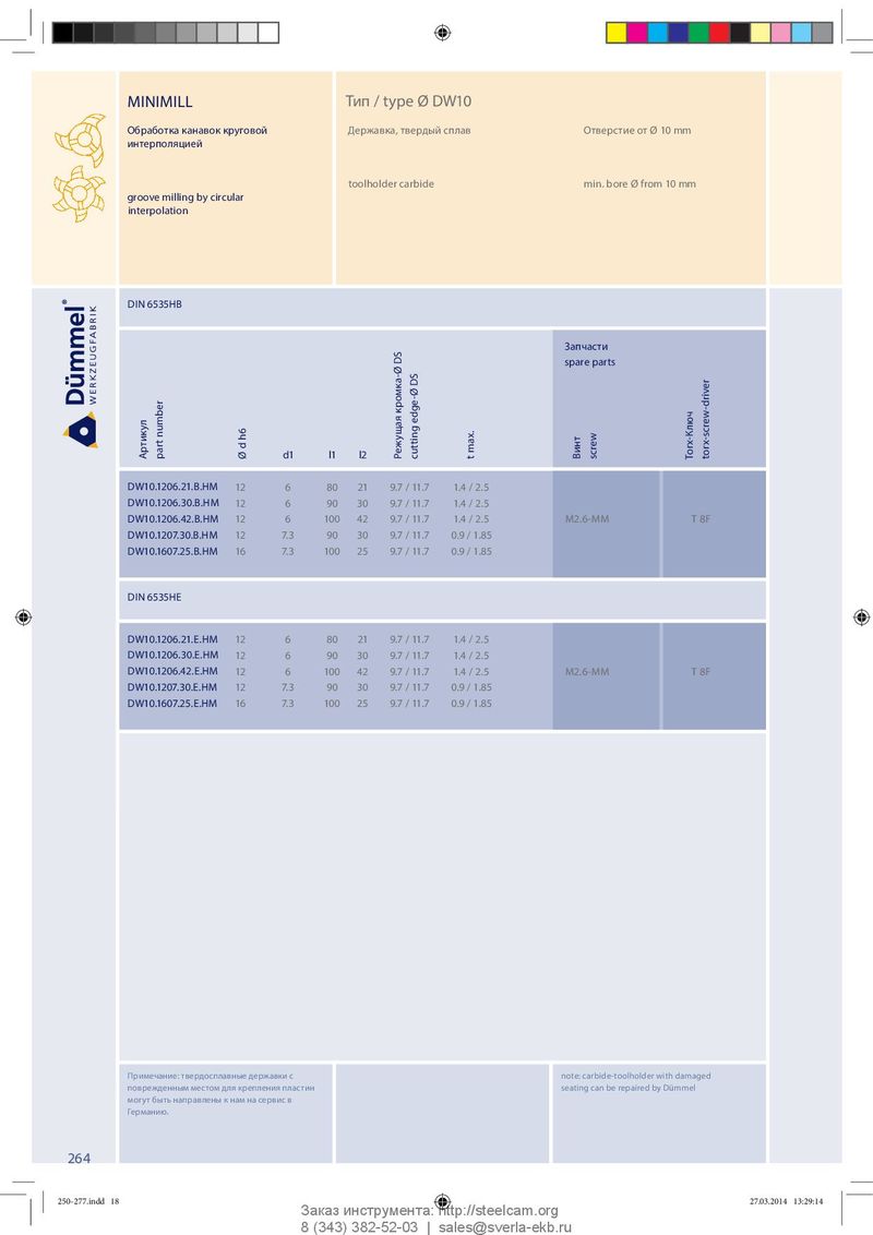 MINIMILL Тип / type Ø DW10 Обработка канавок круговой Державка, твердый сплав Отверстие от Ø 10 mm интерполяцией toolholder carbide min. bore Ø from 10 mm groove milling by circular interpolation DIN 6535HB Запчасти spare parts Артикул part number d1 l1 l2 Ø d h6 Режущая кромка-Ø DS cutting edge-Ø DS t max. Винт screw Torx-Ключ torx-screw-driver DW10.1206.21.B.HM 12 6 80 21 9.7 / 11.7 1.4 / 2.5 DW10.1206.30.B.HM 12 6 90 30 9.7 / 11.7 1.4 / 2.5 DW10.1206.42.B.HM 12 6 100 42 9.7 / 11.7 1.4 / 2.5 M2.6-MM T 8F DW10.1207.30.B.HM 12 7.3 90 30 9.7 / 11.7 0.9 / 1.85 DW10.1607.25.B.HM 16 7.3 100 25 9.7 / 11.7 0.9 / 1.85 DIN 6535HE DW10.1206.21.E.HM 12 6 80 21 9.7 / 11.7 1.4 / 2.5 DW10.1206.30.E.HM 12 6 90 30 9.7 / 11.7 1.4 / 2.5 DW10.1206.42.E.HM 12 6 100 42 9.7 / 11.7 1.4 / 2.5 M2.6-MM T 8F DW10.1207.30.E.HM 12 7.3 90 30 9.7 / 11.7 0.9 / 1.85 DW10.1607.25.E.HM 16 7.3 100 25 9.7 / 11.7 0.9 / 1.85 Примечание: твердосплавные державки с note: carbide-toolholder with damaged поврежденным местом для крепления пластин seating can be repaired by Dümmel могут быть направлены к нам на сервис в Германию. 264 250-277.indd 18 250-277.indd 18 27.03.2014 13:29:14 27.03.2014 13:29:14 Заказ инструмента: http://steelcam.org 8 (343) 382-52-03 | sales@sverla-ekb.ru