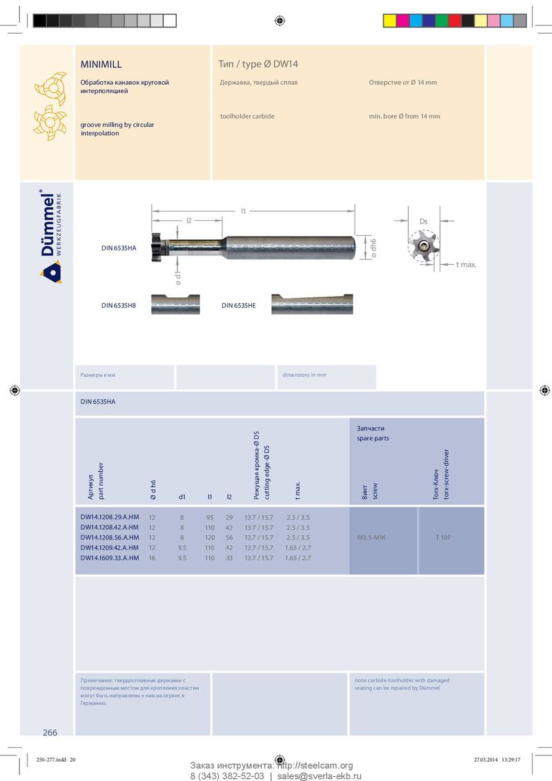 MINIMILL Тип / type Ø DW14 Обработка канавок круговой Державка, твердый сплав Отверстие от Ø 14 mm интерполяцией toolholder carbide min. bore Ø from 14 mm groove milling by circular interpolation l1 l2 Ds DIN 6535HA ø dh6 t max. ø d1 DIN 6535HB DIN 6535HE Размеры в мм dimensions in mm DIN 6535HA Запчасти spare parts Артикул part number d1 l1 l2 Ø d h6 Режущая кромка-Ø DS cutting edge-Ø DS t max. Винт screw Torx-Ключ torx-screw-driver D W14 .12 0 8 . 2 9. A . H M 12 8 95 29 13.7 / 15.7 2.5 / 3.5 DW14.1208.42.A.HM 12 8 110 42 13.7 / 15.7 2.5 / 3.5 DW14.1208.56.A.HM 12 8 120 56 13.7 / 15.7 2.5 / 3.5 M3.5-MM T 10F DW14.1209.42.A.HM 12 9.5 110 42 13.7 / 15.7 1.65 / 2.7 DW14.1609.33.A.HM 16 9.5 110 33 13.7 / 15.7 1.65 / 2.7 Примечание: твердосплавные державки с note: carbide-toolholder with damaged поврежденным местом для крепления пластин seating can be repaired by Dümmel могут быть направлены к нам на сервис в Германию. 266 250-277.indd 20 250-277.indd 20 27.03.2014 13:29:17 27.03.2014 13:29:17 Заказ инструмента: http://steelcam.org 8 (343) 382-52-03 | sales@sverla-ekb.ru
