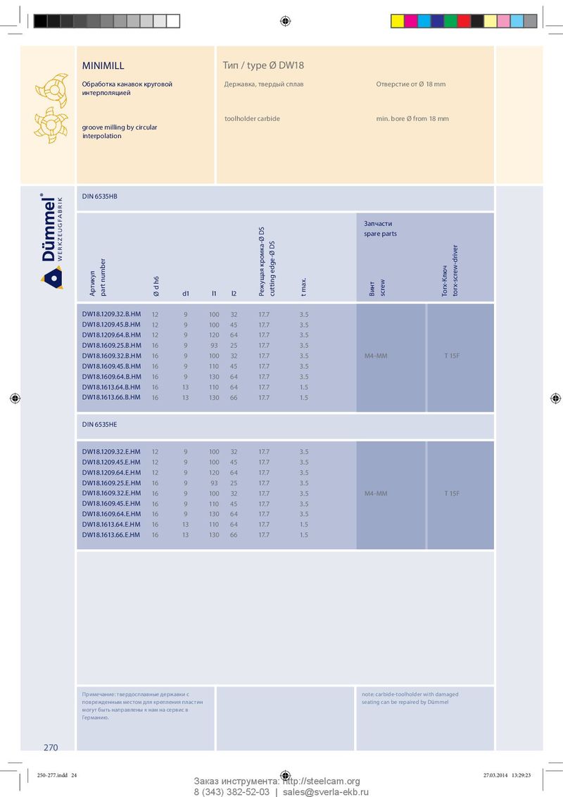 MINIMILL Тип / type Ø DW18 Обработка канавок круговой Державка, твердый сплав Отверстие от Ø 18 mm интерполяцией toolholder carbide min. bore Ø from 18 mm groove milling by circular interpolation DIN 6535HB Запчасти spare parts Артикул part number d1 l1 l2 Ø d h6 Режущая кромка-Ø DS cutting edge-Ø DS t max. Винт screw Torx-Ключ torx-screw-driver DW18.1209.32.B.HM 12 9 100 32 17.7 3.5 DW18.1209.45.B.HM 12 9 100 45 17.7 3.5 DW18.1209.64.B.HM 12 9 120 64 17.7 3.5 DW18.1609.25.B.HM 16 9 93 25 17.7 3.5 DW18.1609.32.B.HM 16 9 100 32 17.7 3.5 M4-MM T 15F DW18.1609.45.B.HM 16 9 110 45 17.7 3.5 DW18.1609.64.B.HM 16 9 130 64 17.7 3.5 DW18.1613.64.B.HM 16 13 110 64 17.7 1.5 DW18.1613.66.B.HM 16 13 130 66 17.7 1.5 DIN 6535HE DW18.1209.32.E.HM 12 9 100 32 17.7 3.5 DW18.1209.45.E.HM 12 9 100 45 17.7 3.5 DW18.1209.64.E.HM 12 9 120 64 17.7 3.5 DW18.1609.25.E.HM 16 9 93 25 17.7 3.5 DW18.1609.32.E.HM 16 9 100 32 17.7 3.5 M4-MM T 15F DW18.1609.45.E.HM 16 9 110 45 17.7 3.5 DW18.1609.64.E.HM 16 9 130 64 17.7 3.5 DW18.1613.64.E.HM 16 13 110 64 17.7 1.5 DW18.1613.66.E.HM 16 13 130 66 17.7 1.5 Примечание: твердосплавные державки с note: carbide-toolholder with damaged поврежденным местом для крепления пластин seating can be repaired by Dümmel могут быть направлены к нам на сервис в Германию. 270 250-277.indd 24 250-277.indd 24 27.03.2014 13:29:23 27.03.2014 13:29:23 Заказ инструмента: http://steelcam.org 8 (343) 382-52-03 | sales@sverla-ekb.ru