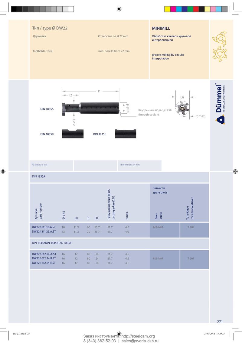 Тип / type Ø DW22 MINIMILL Державка Отверстие от Ø 22 mm Обработка канавок круговой интерполяцией toolholder steel min. bore Ø from 22 mm groove milling by circular interpolation l1 l2 Ds DIN 1835A Внутренний подвод СОЖ ø dh6 through coolant t max. Innere Kühlmitt through coolant ø d1 DIN 1835B DIN 1835E Размеры в мм dimensions in mm DIN 1835A Запчасти spare parts Артикул part number d1 l1 l2 Ø d h6 Режущая кромка-Ø DS cutting edge-Ø DS t max. Винт screw Torx-Ключ torx-screw-driver DW22.1011.10.A.ST 10 11.3 60 10.7 21.7 4.5 M5-MM T 20F DW22.1311.25.A.ST 13 11.3 70 25.7 21.7 4.0 DIN 1835A DIN 1835B DIN 1835E DW22.1612.24.A.ST 16 12 80 24 21.7 4.5 DW22.1612.24.B.ST 16 12 80 24 21.7 4.5 M5-MM T 20F DW22.1612.24.E.ST 16 12 80 24 21.7 4.5 271 250-277.indd 25 250-277.indd 25 27.03.2014 13:29:23 27.03.2014 13:29:23 Заказ инструмента: http://steelcam.org 8 (343) 382-52-03 | sales@sverla-ekb.ru