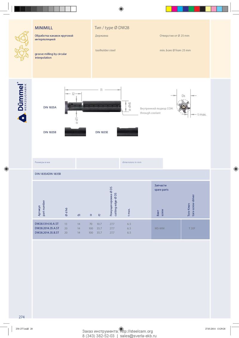 MINIMILL Тип / type Ø DW28 Обработка канавок круговой Державка Отверстие от Ø 25 mm интерполяцией toolholder steel min. bore Ø from 25 mm groove milling by circular interpolation l1 l2 Ds DIN 1835A Внутренний подвод СОЖ ø dh6 through coolant t max. Innere Kühlmitt through coolant ø d1 DIN 1835B DIN 1835E Размеры в мм dimensions in mm DIN 1835A DIN 1835B Запчасти spare parts Артикул part number d1 l1 l2 Ø d h6 Режущая кромка-Ø DS cutting edge-Ø DS t max. Винт screw Torx-Ключ torx-screw-driver DW28.1314.10.A.ST 13 14 70 10.7 27.7 6.5 DW28.2014.35.A.ST 20 14 100 35.7 27.7 6.5 M5-MM T 20F DW28.2014.35.B.ST 20 14 100 35.7 27.7 6.5 274 250-277.indd 28 250-277.indd 28 27.03.2014 13:29:28 27.03.2014 13:29:28 Заказ инструмента: http://steelcam.org 8 (343) 382-52-03 | sales@sverla-ekb.ru