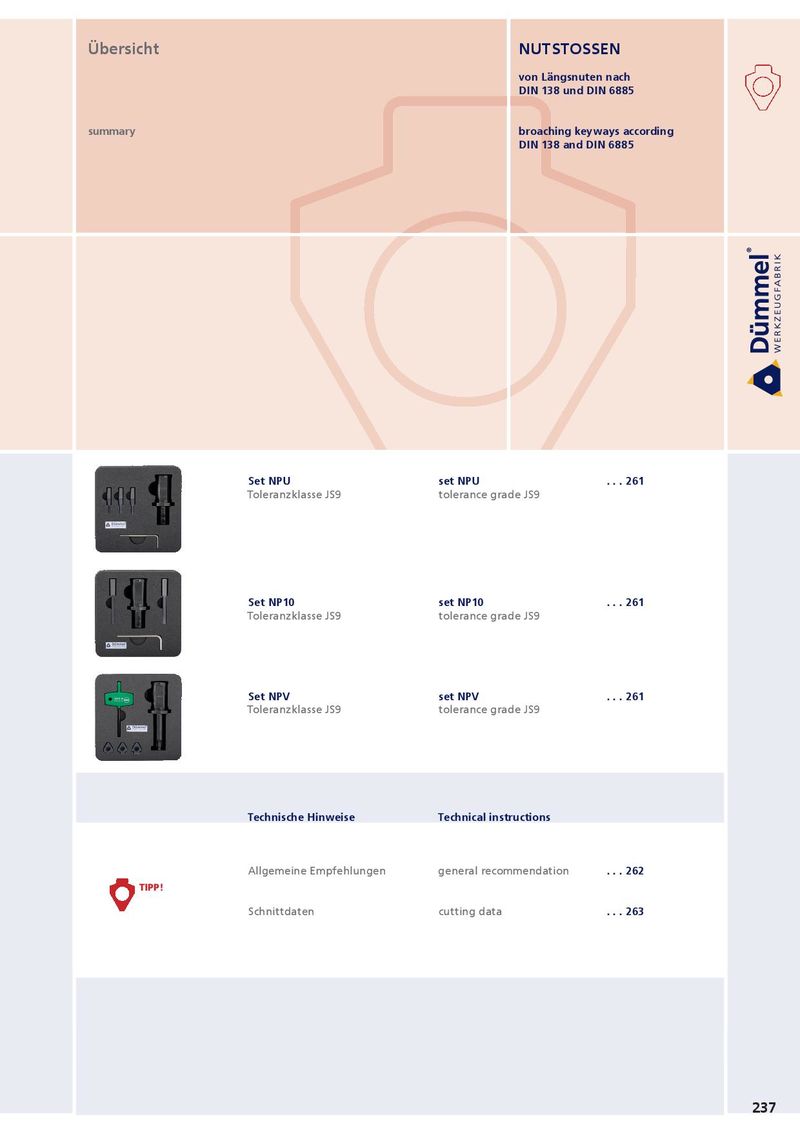 Übersicht NUTSTOSSEN von Längsnuten nach DIN 138 und DIN 6885 summary broaching keyways according DIN 138 and DIN 6885 Set NPU set NPU . . . 261 Toleranzklasse JS9 tolerance grade JS9 Set NP10 set NP10 . . . 261 Toleranzklasse JS9 tolerance grade JS9 Set NPV set NPV . . . 261 Toleranzklasse JS9 tolerance grade JS9 Technische Hinweise Technical instructions Allgemeine Empfehlungen general recommendation . . . 262 TIPP! Schnittdaten cutting data . . . 263 237