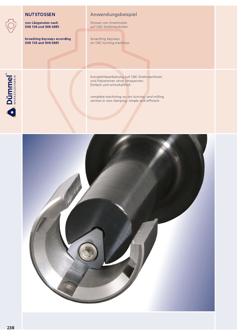 NUTSTOSSEN Anwendungsbeispiel von Längsnuten nach Stossen von Innennuten DIN 138 und DIN 6885 auf CNC-Drehmaschinen broaching keyways according broaching keyways DIN 138 and DIN 6885 on CNC turning machines Komplettbearbeitung auf CNC-Drehmaschinen und Fräszentren ohne Umspannen. Einfach und wirtschaftlich complete machining on cnc turning- and milling centres in one clamping. simple and efficient 238