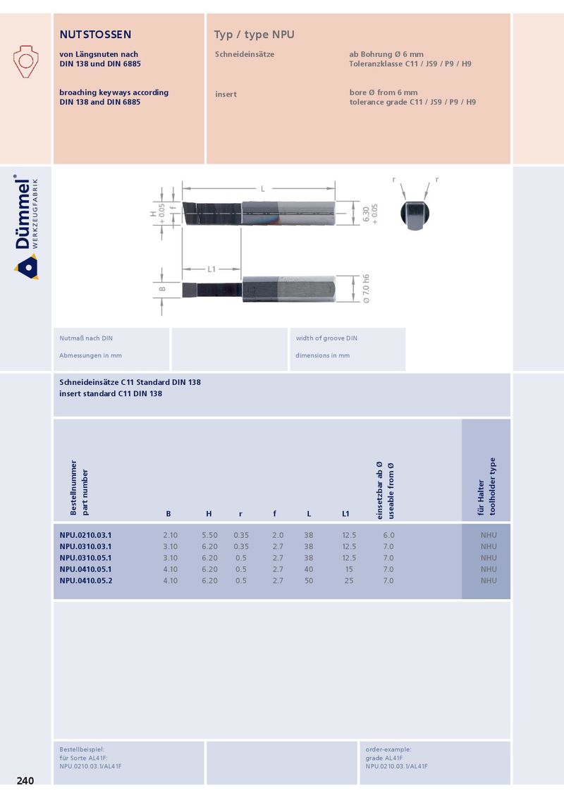 5° 5° NUTSTOSSEN Typ / type NPU von Längsnuten nach Schneideinsätze ab Bohrung Ø 6 mm DIN 138 und DIN 6885 Ds = 21.7 Ds = 21.7 Toleranzklasse C11 / JS9 / P9 / H9 L2 L2 broaching keyways according insert bore Ø from 6 mm DIN 138 and DIN 6885 tolerance grade C11 / JS9 / P9 / H9 h h r r r r L L f f H H + 0.05 + 0.05 6.30 6.30 + 0.05 + 0.05 d1 d1 L1 L1 B B Ø 7.0 h6 Ø 7.0 h6 Nutmaß nach DIN width of groove DIN Abmessungen in mm dimensions in mm Schneideinsätze C11 Standard DIN 138 insert standard C11 DIN 138 Bestellnummer part number B H r f L L1 für Halter toolholder type einsetzbar ab Ø useable from Ø NPU.0210.03.1 2.10 5.50 0.35 2.0 38 12.5 6.0 NHU NPU.0310.03.1 3.10 6.20 0.35 2.7 38 12.5 7.0 NHU NPU.0310.05.1 3.10 6.20 0.5 2.7 38 12.5 7.0 NHU NPU.0410.05.1 4.10 6.20 0.5 2.7 40 15 7.0 NHU NPU.0410.05.2 4.10 6.20 0.5 2.7 50 25 7.0 NHU Bestellbeispiel: order-example: für Sorte AL41F: grade AL41F NPU.0210.03.1/AL41F NPU.0210.03.1/AL41F 240