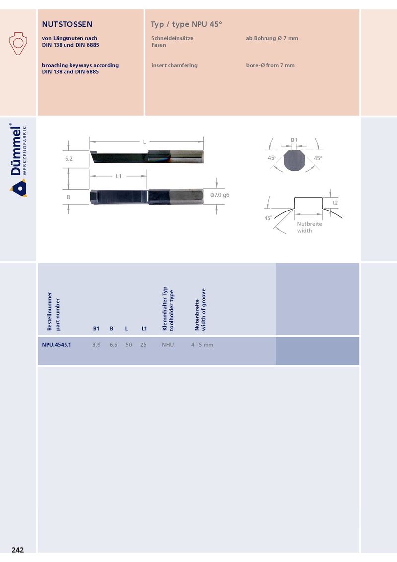 NUTSTOSSEN Typ / type NPU 45° von Längsnuten nach Schneideinsätze ab Bohrung Ø 7 mm DIN 138 und DIN 6885 Fasen 5° 5° broaching keyways according insert chamfering bore-Ø from 7 mm DIN 138 and DIN 6885 Ds = 21.7 Ds = 21.7 L2 L2 r r r r B1 B1 L L h h 6.2 6.2 45° 45° 45° 45° 6.30 6.30 L1 L1 ø7.0 g6 ø7.0 g6 B B t2 t2 d1 d1 Nutbreite Nutbreite 45 ° 45 ° width width Nutbreite width t2 t2 Nutbreite B width Nutbreite width L1 L1 Bestellnummer part number B1 B L L1 Klemmhalter Typ toolholder type Nutenbreite width of groove NPU.4545.1 3.6 6.5 50 25 NHU 4 - 5 mm B Nutbreite width B B t2 t2 242