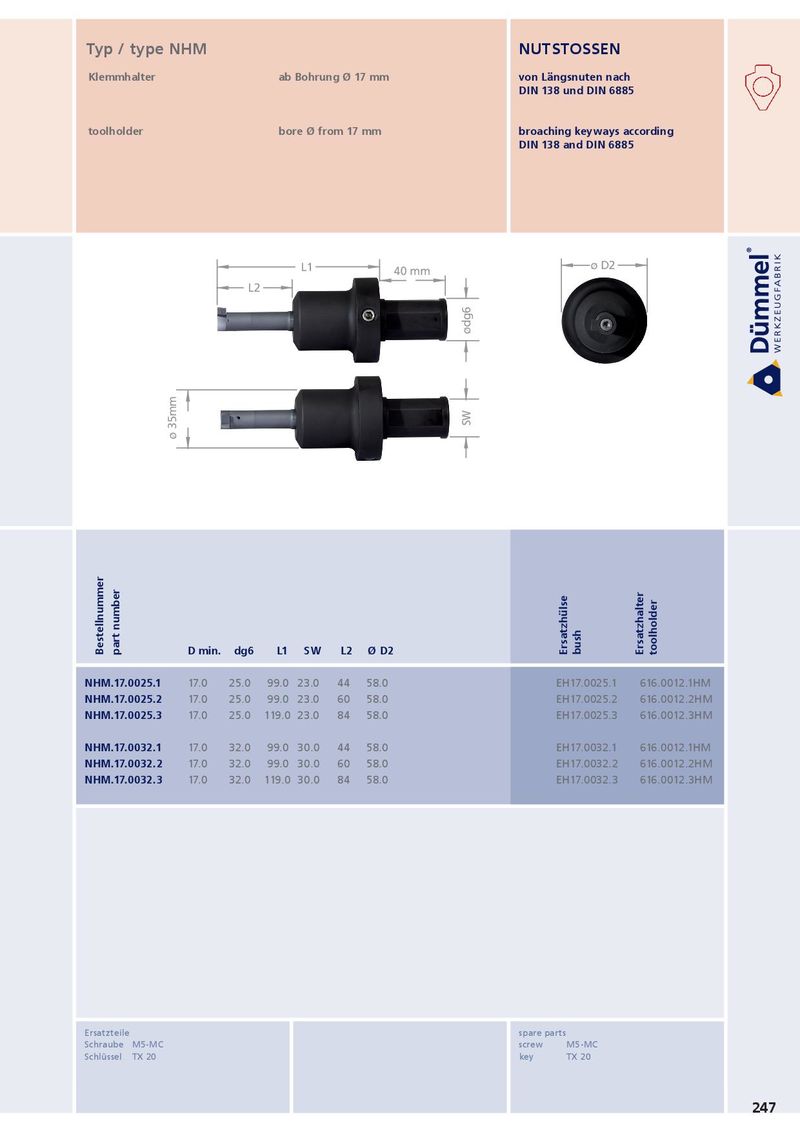 Typ / type NHM NUTSTOSSEN 5° 5° Klemmhalter ab Bohrung Ø 17 mm von Längsnuten nach DIN 138 und DIN 6885 Ds = 21.7 Ds = 21.7 toolholder L2 L2 bore Ø from 17 mm broaching keyways according DIN 138 and DIN 6885 r r r r H H + 0.05 + 0.05 9.20 + 0.05 9.20 + 0.05 h h L1 L1 ø D2 ø D2 40 mm 40 mm L2 L2 ødg6 ødg6 B B SW SW ø 35mm ø 35mm L L L2 L2 f f a a øDh6 øDh6 Bestellnummer part number D min. dg6 L1 SW L2 Ø D2 Ersatzhülse bush Ersatzhalter toolholder NHM.17.0025.1 17.0 25.0 99.0 23.0 44 58.0 EH17.0025.1 616.0012.1HM NHM.17.0025.2 17.0 25.0 99.0 23.0 60 58.0 EH17.0025.2 616.0012.2HM NHM.17.0025.3 17.0 25.0 119.0 23.0 84 58.0 EH17.0025.3 616.0012.3HM NHM.17.0032.1 17.0 32.0 99.0 30.0 44 58.0 EH17.0032.1 616.0012.1HM NHM.17.0032.2 17.0 32.0 99.0 30.0 60 58.0 EH17.0032.2 616.0012.2HM NHM.17.0032.3 17.0 32.0 119.0 30.0 84 58.0 EH17.0032.3 616.0012.3HM Ersatzteile spare parts Schraube M5-MC screw M5-MC Schlüssel TX 20 key TX 20 247