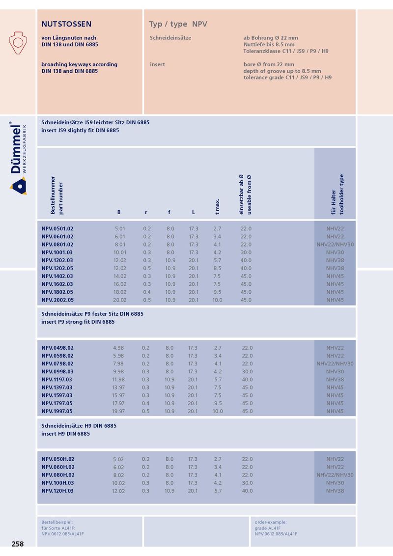 NUTSTOSSEN Typ / type NPV von Längsnuten nach Schneideinsätze ab Bohrung Ø 22 mm DIN 138 und DIN 6885 Nuttiefe bis 8.5 mm Toleranzklasse C11 / JS9 / P9 / H9 broaching keyways according insert bore Ø from 22 mm DIN 138 and DIN 6885 depth of groove up to 8.5 mm tolerance grade C11 / JS9 / P9 / H9 Schneideinsätze JS9 leichter Sitz DIN 6885 insert JS9 slightly fit DIN 6885 Bestellnummer part number B r f L t max. einsetzbar ab Ø useable from Ø für Halter toolholder type NPV.0501.02 5.01 0.2 8.0 17.3 2.7 22.0 NHV22 NPV.0601.02 6.01 0.2 8.0 17.3 3.4 22.0 NHV22 NPV.0801.02 8.01 0.2 8.0 17.3 4.1 22.0 NHV22/NHV30 NPV.1001.03 10.01 0.3 8.0 17.3 4.2 30.0 NHV30 NPV.1202.03 12.02 0.3 10.9 20.1 5.7 40.0 NHV38 NPV.1202.05 12.02 0.5 10.9 20.1 8.5 40.0 NHV38 NPV.1402.03 14.02 0.3 10.9 20.1 7.5 45.0 NHV45 NPV.1602.03 16.02 0.3 10.9 20.1 7.5 45.0 NHV45 NPV.1802.05 18.02 0.4 10.9 20.1 9.5 45.0 NHV45 NPV.2002.05 20.02 0.5 10.9 20.1 10.0 45.0 NHV45 Schneideinsätze P9 fester Sitz DIN 6885 insert P9 strong fit DIN 6885 NPV.0498.02 4.98 0.2 8.0 17.3 2.7 22.0 NHV22 NPV.0598.02 5.98 0.2 8.0 17.3 3.4 22.0 NHV22 NPV.0798.02 7.98 0.2 8.0 17.3 4.1 22.0 NHV22/NHV30 NPV.0998.03 9.98 0.3 8.0 17.3 4.2 30.0 NHV30 NPV.1197.03 11.98 0.3 10.9 20.1 5.7 40.0 NHV38 NPV.1397.03 13.97 0.3 10.9 20.1 7.5 45.0 NHV45 NPV.1597.03 15.97 0.3 10.9 20.1 7.5 45.0 NHV45 NPV.1797.05 17.97 0.4 10.9 20.1 9.5 45.0 NHV45 NPV.1997.05 19.97 0.5 10.9 20.1 10.0 45.0 NHV45 Schneideinsätze H9 DIN 6885 insert H9 DIN 6885 NPV.050H.02 5.02 0.2 8.0 17.3 2.7 22.0 NHV22 NPV.060H.02 6.02 0.2 8.0 17.3 3.4 22.0 NHV22 NPV.080H.02 8.02 0.2 8.0 17.3 4.1 22.0 NHV22/NHV30 NPV.100H.03 10.02 0.3 8.0 17.3 4.2 30.0 NHV30 NPV.120H.03 12.02 0.3 10.9 20.1 5.7 40.0 NHV38 Bestellbeispiel: order-example: für Sorte AL41F: grade AL41F NPV.0612.085/AL41F NPV.0612.085/AL41F 258