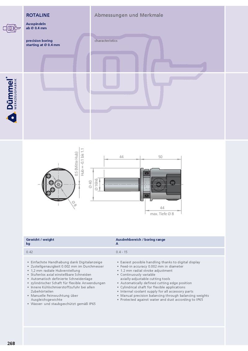 ROTAlinE Abmessungen und Merkmale Ausspindeln ab Ø 0.4 mm precision boring characteristics starting at Ø 0.4 mm Ø Ds Ø Dh6 60° L1 b s Ø d1 44 50 60° 0.5 (Mitte Hub) Hub = -0.1 bis 1.1 Die Pfeile und Linien sind gut so. Alles sollte in schwarz 50% angelegt Ø 40 werden. Text mit der Schrift "Fru" Ø 16h6 erstellt werden. Wie bei den anderen Katalogen auch. Größe: 9 pt. Zeilenab- Ø 8 stand: 11 pt. Der engl. Text wird in der 44 Fru light kursiv (Italic) gesetzt. max. Tiefe Ø 8 Gewicht / weight Ausdrehbereich / boring range kg A 0.42 0.4 - 15 • Einfachste Handhabung dank Digitalanzeige • Easiest possible handling thanks to digital display • Zustellgenauigkeit 0.002 mm im Durchmesser • Feed-in accuracy 0.002 mm in diameter • 1,2 mm radiale Hubverstellung • 1.2 mm radial stroke adjustment • Stufenlos axial einstellbare Schneiden • Continuously variable • Automatisch definierte Schneidenlage axially-adjustable cutting tools • zylindrischer Schaft für flexible Anwendungen • Automatically defined cutting edge position • Innere Kühlschmierstoffzufuhr bei allen • Cylindrical shaft for flexible applications Zubehörteilen • Internal coolant supply for all accessory parts • Manuelle Feinwuchtung über • Manual precision balancing through balancing weights Ausgleichsgewichte • Protected against water and dust according to IP65 • Wasser- und staubgeschützt gemäß IP65 268