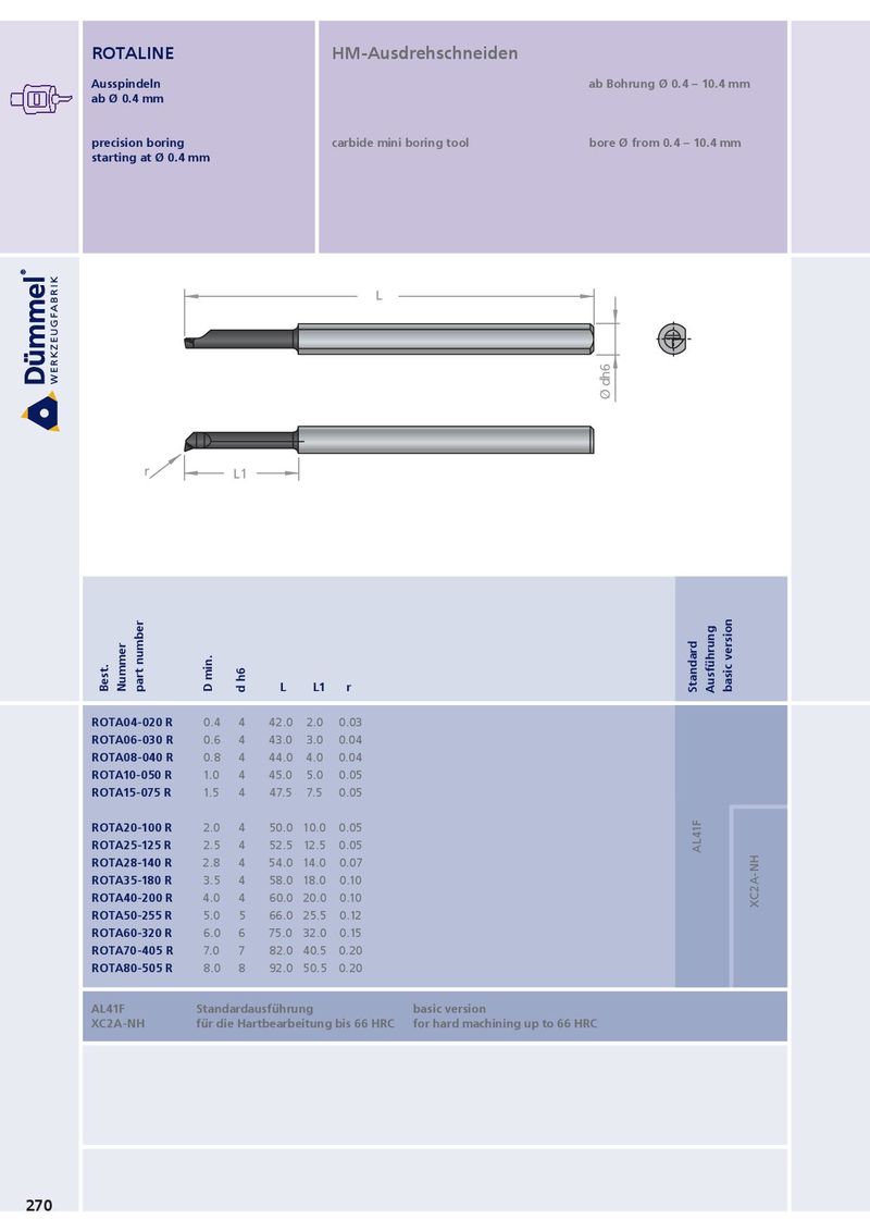 s Ø Ds 20 Ø 8 Ø 16h6 Ø d 50 Ø 8 b s Ø d1 0.5 (Mitte Hub) Hub = -0.1 bis 1.1 t max. ROTAlinE HM-Ausdrehschneiden Ausspindeln ab Bohrung Ø 0.4 – 10.4 mm ab Ø 0.4 mm 60° precision boring carbide mini boring tool bore Ø from 0.4 – 10.4 mm Ø 16h6 starting at Ø 0.4 mm Ø 8 L Ø dh6 r L1 Best. nummer part number D min. l l1 r d h6 Standard Ausführung basic version ROTA04-020 R 0.4 4 42.0 2.0 0.03 ROTA06-030 R 0.6 4 43.0 3.0 0.04 ROTA08-040 R 0.8 4 44.0 4.0 0.04 ROTA10-050 R 1.0 4 45.0 5.0 0.05 ROTA15-075 R 1.5 4 47.5 7.5 0.05 ROTA20-100 R 2.0 4 50.0 10.0 0.05 ROTA25-125 R 2.5 4 52.5 12.5 0.05 AL41F ROTA28-140 R 2.8 4 54.0 14.0 0.07 ROTA35-180 R 3.5 4 58.0 18.0 0.10 ROTA40-200 R 4.0 4 60.0 20.0 0.10 XC2A-NH ROTA50-255 R 5.0 5 66.0 25.5 0.12 ROTA60-320 R 6.0 6 75.0 32.0 0.15 ROTA70-405 R 7.0 7 82.0 40.5 0.20 ROTA80-505 R 8.0 8 92.0 50.5 0.20 Al41F Standardausführung basic version XC2A-nH für die Hartbearbeitung bis 66 HRC for hard machining up to 66 HRC 270