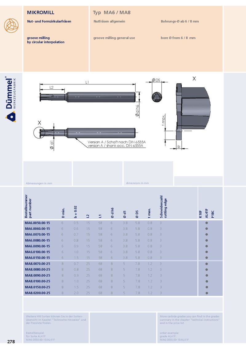 MIKROMILL Typ MA6 / MA8 Nut- und Formzirkularfräsen Nutfräsen allgemein Bohrungs-Ø ab 6 / 8 mm groove milling groove milling general use bore Ø from 6 / 8 mm by circular interpolation DS X L1 L2 d h6 X t max. Version A / Schaft nach DIN 6535A d1 version A / shank acc. DIN 6535A b Abmessungen in mm dimensions in mm Bestellnummer part number D min. b ± 0.02 L2 L1 Ø d h6 Ø d1 Ø DS t max. Schneidenzahl cutting edge K10F AL41F P18C MA6.0050.00-15 6 0.5 15 58 6 3.8 5.8 0.8 3 ˜ MA6.0060.00-15 6 0.6 15 58 6 3.8 5.8 0.8 3 ˜ MA6.0070.00-15 6 0.7 15 58 6 3.8 5.8 0.8 3 ˜ MA6.0080.00-15 6 0.8 15 58 6 3.8 5.8 0.8 3 ˜ MA6.0090.00-15 6 0.9 15 58 6 3.8 5.8 0.8 3 ˜ MA6.0100.00-15 6 1.0 15 58 6 3.8 5.8 0.8 3 ˜ MA6.0150.00-15 6 1.5 15 58 6 3.8 5.8 0.8 3 ˜ MA8.0070.00-25 8 0.7 25 68 8 5 7.8 1.2 3 ˜ MA8.0080.00-25 8 0.8 25 68 8 5 7.8 1.2 3 ˜ MA8.0090.00-25 8 0.9 25 68 8 5 7.8 1.2 3 ˜ MA8.0100.00-25 8 1.0 25 68 8 5 7.8 1.2 3 ˜ MA8.0150.00-25 8 1.5 25 68 8 5 7.8 1.2 3 ˜ MA8.0200.00-25 8 2.0 25 68 8 5 7.8 1.2 3 ˜ Weitere HM Sorten können Sie in der Sorten- More carbide grades you can find in the grades übersicht im Kapitel "Technische Hinweise" und summary in the chapter "technical instructions" der Preisliste finden. and in the price list. Bestellbeispiel: order-example: für Sorte AL41F: grade AL41F: MA6.0050.00-15/AL41F MA6.0050.00-15/AL41F 278
