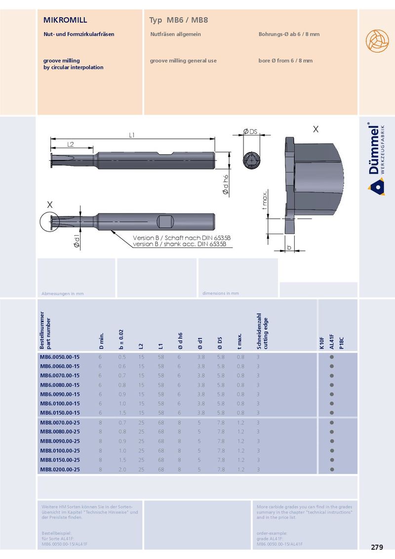 MIKROMILL Typ MB6 / MB8 Nut- und Formzirkularfräsen Nutfräsen allgemein Bohrungs-Ø ab 6 / 8 mm groove milling groove milling general use bore Ø from 6 / 8 mm by circular interpolation DS X L1 L2 d h6 X t max. d1 Version B / Schaft nach DIN 6535B version B / shank acc. DIN 6535B b Abmessungen in mm dimensions in mm Bestellnummer part number D min. b ± 0.02 L2 L1 Ø d h6 Ø d1 Ø DS t max. Schneidenzahl cutting edge K10F AL41F P18C MB6.0050.00-15 6 0.5 15 58 6 3.8 5.8 0.8 3 ˜ MB6.0060.00-15 6 0.6 15 58 6 3.8 5.8 0.8 3 ˜ MB6.0070.00-15 6 0.7 15 58 6 3.8 5.8 0.8 3 ˜ MB6.0080.00-15 6 0.8 15 58 6 3.8 5.8 0.8 3 ˜ MB6.0090.00-15 6 0.9 15 58 6 3.8 5.8 0.8 3 ˜ MB6.0100.00-15 6 1.0 15 58 6 3.8 5.8 0.8 3 ˜ MB6.0150.00-15 6 1.5 15 58 6 3.8 5.8 0.8 3 ˜ MB8.0070.00-25 8 0.7 25 68 8 5 7.8 1.2 3 ˜ MB8.0080.00-25 8 0.8 25 68 8 5 7.8 1.2 3 ˜ MB8.0090.00-25 8 0.9 25 68 8 5 7.8 1.2 3 ˜ MB8.0100.00-25 8 1.0 25 68 8 5 7.8 1.2 3 ˜ MB8.0150.00-25 8 1.5 25 68 8 5 7.8 1.2 3 ˜ MB8.0200.00-25 8 2.0 25 68 8 5 7.8 1.2 3 ˜ Weitere HM Sorten können Sie in der Sorten- More carbide grades you can find in the grades übersicht im Kapitel "Technische Hinweise" und summary in the chapter "technical instructions" der Preisliste finden. and in the price list. Bestellbeispiel: order-example: für Sorte AL41F: grade AL41F: MB6.0050.00-15/AL41F MB6.0050.00-15/AL41F 279