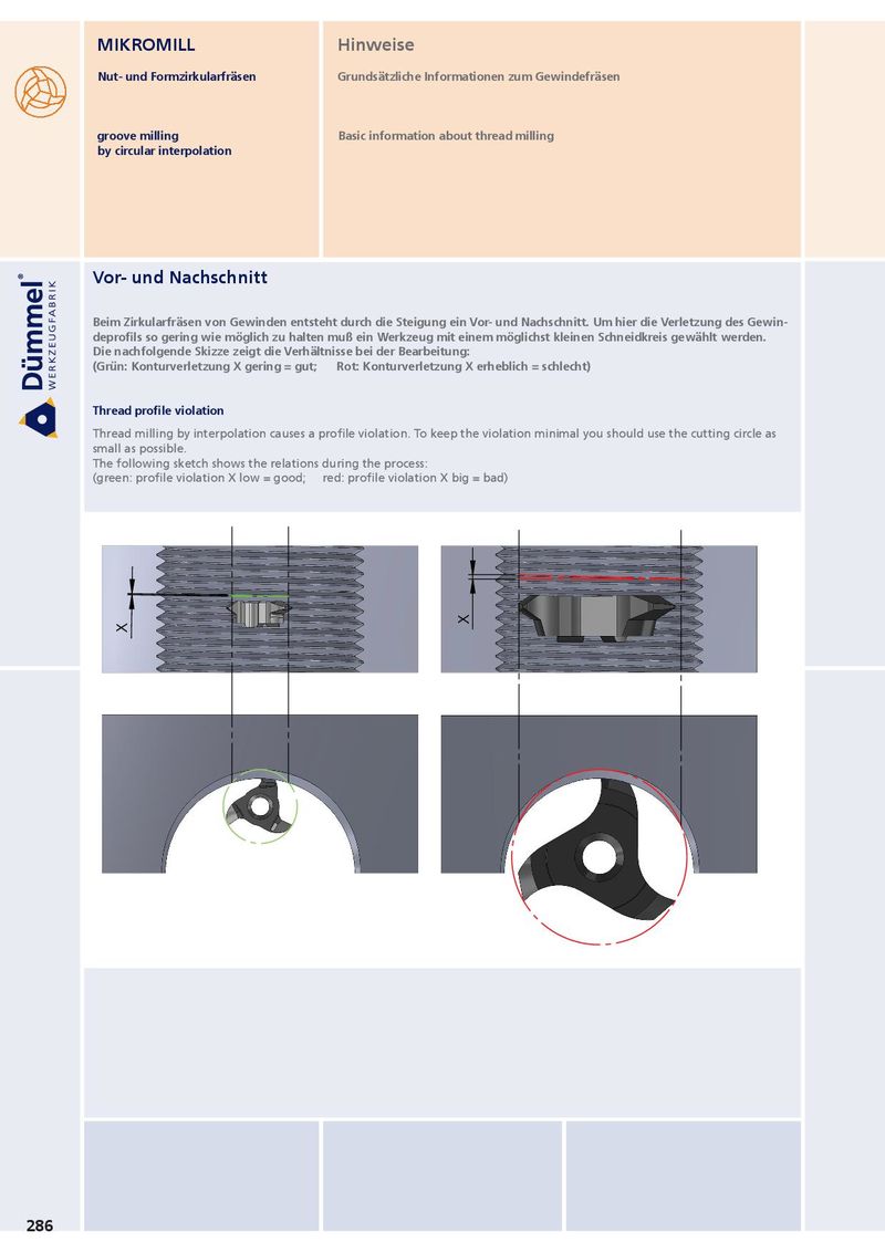 MIKROMILL Hinweise Nut- und Formzirkularfräsen Grundsätzliche Informationen zum Gewindefräsen groove milling Basic information about thread milling by circular interpolation Vor- und Nachschnitt Beim Zirkularfräsen von Gewinden entsteht durch die Steigung ein Vor- und Nachschnitt. Um hier die Verletzung des Gewin- deprofils so gering wie möglich zu halten muß ein Werkzeug mit einem möglichst kleinen Schneidkreis gewählt werden. Die nachfolgende Skizze zeigt die Verhältnisse bei der Bearbeitung: (Grün: Konturverletzung X gering = gut; Rot: Konturverletzung X erheblich = schlecht) Thread profile violation Thread milling by interpolation causes a profile violation. To keep the violation minimal you should use the cutting circle as small as possible. The following sketch shows the relations during the process: (green: profile violation X low = good; red: profile violation X big = bad) x x 286