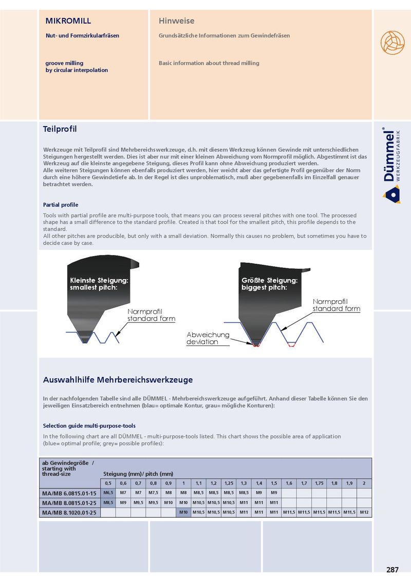 MIKROMILL Hinweise Nut- und Formzirkularfräsen Grundsätzliche Informationen zum Gewindefräsen groove milling Basic information about thread milling by circular interpolation Teilprofil Werkzeuge mit Teilprofil sind Mehrbereichswerkzeuge, d.h. mit diesem Werkzeug können Gewinde mit unterschiedlichen Steigungen hergestellt werden. Dies ist aber nur mit einer kleinen Abweichung vom Normprofil möglich. Abgestimmt ist das Werkzeug auf die kleinste angegebene Steigung, dieses Profil kann ohne Abweichung produziert werden. Alle weiteren Steigungen können ebenfalls produziert werden, hier weicht aber das gefertigte Profil gegenüber der Norm durch eine höhere Gewindetiefe ab. In der Regel ist dies unproblematisch, muß aber gegebenenfalls im Einzelfall genauer betrachtet werden. Partial profile Tools with partial profile are multi-purpose tools, that means you can process several pitches with one tool. The processed shape has a small difference to the standard profile. Created is that tool for the smallest pitch, this profile depends to the standard. All other pitches are producible, but only with a small deviation. Normally this causes no problem, but sometimes you have to decide case by case. Kleinste Steigung: Größte Steigung: smallest pitch: biggest pitch: Normprofil standard form Normprofil standard form Abweichung deviation Auswahlhilfe Mehrbereichswerkzeuge In der nachfolgenden Tabelle sind alle DÜMMEL - Mehrbereichswerkzeuge aufgeführt. Anhand dieser Tabelle können Sie den jeweiligen Einsatzbereich entnehmen (blau= optimale Kontur, grau= mögliche Konturen): Selection guide multi-purpose-tools In the following chart are all DÜMMEL - multi-purpose-tools listed. This chart shows the possible area of application (blue= optimal profile; grey= possible profiles): ab Gewindegröße / starting with thread-size Steigung (mm)/ pitch (mm) 0,5 0,6 0,7 0,8 0,9 1 1,1 1,2 1,25 1,3 1,4 1,5 1,6 1,7 1,75 1,8 1,9 2 MA/MB 6.0815.01-15 M6,5 M7 M7 M7,5 M8 M8 M8,5 M8,5 M8,5 M8,5 M9 M9 MA/MB 8.0815.01-25 M8,5 M9 M9,5 M9,5 M10 M10 M10,5 M10,5 M10,5 M11 M11 M11 MA/MB 8.1020.01-25 M10 M10,5 M10,5 M10,5 M11 M11 M11 M11,5 M11,5 M11,5 M11,5 M11,5 M12 287