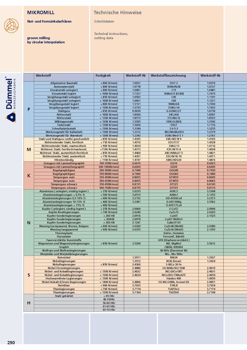 MIKROMILL MIKROMILL Technische Hinweise Nut- und Formzirkularfräsen Nut- und Formzirkularfräsen Schnittdaten Technical instructions, groove milling groove milling cutting data by circular interpolation by circular interpolation Werkstoff Festigkeit Werkstoff-Nr Werkstoffbezeichnung Werkstoff-Nr Werkstoffbezeichnung Werkstoff- Nr Werkstoffbezeichnung Vc fz ( m/min. ) (mm) Allgemeiner Baustahl < 800 N/mm2 1.0037 St37-2 1.0570 St52-3 1.0060 St60-2 0,02 - 0,05 Automatenstahl < 800 N/mm2 1.0718 9SMnPb28 1.0727 45S20 1.0757 46SPb2 40-120 0,02 - 0,05 Einsatzstahl unlegiert < 800 N/mm2 1.0401 C15 1.0481 17Mn4 1.1141 C15E (CK15) 0,02 - 0,05 Einsatzstahl legiert < 1000 N/mm2 1.7331 16MnCr5 (EC80) 1.7015 13Cr3 (EC60) 1.5919 15CrNi6 0,01 - 0,04 Vergütungsstahl unlegiert < 850 N/mm2 1.0503 C45 1.1191 Ck45 1.0535 C55 40-110 0,02 - 0,05 Vergütungsstahl unlegiert < 1000 N/mm2 1.0601 C60 1.1221 Ck60 1.0540 C50 0,01 - 0,04 Vergütungsstahl legiert < 800 N/mm2 1.5131 50MnSi4 1.7030 28Cr4 1.7225 42CrMo4 0,02 - 0,05 Vergütungsstahl legiert < 1300 N/mm2 1.5755 31NiCr14 1.7033 34Cr4 1.3565 48CrMo4 0,007 - 0,03 Haupt- P Stahlguss < 850 N/mm2 0.9650 G-X260Cr27 1.6750 GS-20NiCrMo3 7 1.6582 GS-34 CrNiMo 6 30-110 0,02 - 0,05 Anwendung Nitrierstahl < 1000 N/mm2 1.8504 34CrAl6 1.8507 34AlMo5 1.8509 41CrAlMo7 0,01 - 0,04 Nitrierstahl < 1200 N/mm2 1.8515 31CrMo12 1.8523 39CrMoV19 3 1.8550 34 CrAlNi 7 0,007 - 0,02 Wälzlagerstahl < 1200 N/mm2 1.3505 100Cr6 (W3) 1.3543 X192CrMo17 1.3520 100 CrMn 6 (W4) 0,005 - 0,01 Federstahl < 1200 N/mm2 1.5026 55Si7 1.7176 55Cr3 1.7701 51CrMoV4 0,005 - 0,01 Schnellarbeitsstahl < 1300 N/mm2 1.3344 S 6-5-3 1.3255 S 18-1-2-5 1.3294 PMHS6-5-3-8; ASP30 10-60 0,005 - 0,01 Werkzeugstahl für Kaltarbeit < 1300 N/mm2 1.2312 40CrMnMoS8 6 1.2379 X155CrVMo12 1 1.2316 X38CrMo16; RAMAX 0,005 - 0,01 Werkzeugstahl für Warmbeit < 1300 N/mm2 1.2343 X38CrMoV 5 1 1.2767 X45NiCrMo4 1.2842 90MnCrV8 0,005 - 0,01 Stahl und Stahlguss rostfei geschwefelt < 850 N/mm2 1.4305 X8CrNiS18 9 1.4105 X4CrMoS18 1.4107 GX8CrNi12 0,01 - 0,04 Nichtrostender Stahl, ferritisch < 750 N/mm2 1.4510 X3CrTi17 1.4528 X105CrCoMo18 2 1.4016 X6Cr17 0,02 - 0,05 Nichtrostender Stahl, martensitisch < 900 N/mm2 1.4034 X46Cr13 1.4116 X50CrMoV15 1.4106 X2CrMoSiS18-2-1 0,007 - 0,03 Haupt- M Nichtrost. Stahl, ferritisch/martensit. <1100 N/mm2 1.4313 X3CrNi13-4 1.4028 X30Cr13 1.4104 X14CrMoS17 60-120 0,007 - 0,03 Anwendung Nichtrost. Stahl, austenitisch/ferritisch < 850 N/mm2 1.4460 X8CrNiMo27 5 1.4821 X20CrNiSi25 4 1.4462 X2CrNiMoN22-5-3 (Duplex) 0,007 - 0,03 Nichtrostender Stahl, austenitisch < 750 N/mm2 1.4301 X5CrNi18-10 1.4571 X6CrNiMoTi17 12 2 1.4449 X3CrNiMo18-12-3 0,007 - 0,03 Hitzebeständig < 1100 N/mm2 1.4747 X80CrNiSi20 1.4876 X10NiCrAlTi32-21 1.4825 GX25CrNiSi18-9 0,007 - 0,03 Grauguss mit Lammellengraphit 100-350N/mm2 0.6010 GG10 0.6025 GG25 0,02 - 0,05 Grauguss mit Lammellengraphit 300-1000N/mm2 0.6030 GG30 0.6045 GG45 0,02 - 0,05 Kugelgraphitguss 300-500N/mm2 0.7040 GGG40 0.7050 GGG50 0,02 - 0,05 Kugelgraphitguss 550-800N/mm2 0.7060 GGG60 0.7080 GGG80 0,02 - 0,05 Haupt- K 50-120 Temperguss weis 350-450N/mm2 0.8035 GTW35 0.8045 GTW45 0,02 - 0,05 Anwendung Temperguss weis 500-650N/mm2 0.8055 GTW55 0.8065 GTW65 0,02 - 0,05 Temperguss schwarz 350-450N/mm2 0.8135 GTS35 0.8145 GTS45 0,02 - 0,05 Temperguss schwarz 500-700N/mm2 0.8155 GTS55 0.8170 GTS70 0,02 - 0,05 Aluminium ( unlegiert, niedrig legiert ) < 350 N/mm2 3.0255 Al99,5 3.3308 Al99,9Mg0,5 3.0256 E-Al H 0,02 - 0,07 Aluminiumlegierungen < 0,5% Si < 500 N/mm2 3.0515 AlMn1 3.1355 AlCuMg2 3.3315 AlMg1 0,02 - 0,07 Aluminiumlegierungen 0,5-10% Si < 400 N/mm2 3.2152 GD-AlSi6Cu4 3.2373 GD-AlSi9Mg 3.2134 GD-AlSi5Cu1Mg 70-140 0,02 - 0,07 Aluminiumlegierungen 10-15% Si < 400 N/mm2 3.2381 G-AlSi10Mg 3.5562 G-MgAl6 3.2525 S-AlSi12 0,02 - 0,07 Aluminiumlegierungen > 15% Si < 400 N/mm2 G-AlSi17Cu4 G-AlSi25CuNiMg G-AlSi21CuNiMg 0,02 - 0,07 Kupfer ( unlegiert, niedrig legiert ) < 350 N/mm2 2.0060 E-Cu57 2.0090 SF-Cu 2.1522 CuSl2Mn 0,02 - 0,07 Kupfer-Knetlegierungen < 700 N/mm2 2.0240 CuZn15 2.0265 CuZn30 2.0321 CuZn37 0,02 - 0,07 Kupfer-Sonderlegierungen < 200 HB 2.0916 CuAl5 2.1525 CuSi3Mn Ampco 8-16 70-140 0,02 - 0,07 Kupfer-Sonderlegierungen < 300HB 2.0978 CuAl11Ni6Fe5 Ampco18-26 0,02 - 0,07 Haupt- N Kupfer-Sonderlegierungen > 300 HB 2.1247 CuBe2F125 Ampco M-4 0,02 - 0,07 Anwendung Messing kurzspanend, Bronze, Rotguss < 600 N/mm2 2.0360 CuZn40 (Ms60) 2.0380 CuZn39Pb2 (Ms58) 2.0410 CuZn44Pb2 0,02 - 0,07 60-130 Messing langspanend < 600 N/mm2 2.0335 CuZn36 (Ms63) 2.1293 CuCrZr 2.1080 CuSn6Zn6 0,02 - 0,07 Thermoplaste Delrin, Hostalen Makrolon, Novodur Acrylglas, Polystyrol 0,02 - 0,1 Duroplaste Ferrozell, Bakelit Pertinax Resopal 0,02 - 0,1 Faserverstärkte Kunststoffe GFK (Glasfaserverstärkt ) CFK (Kohlefaserverstärkt) AFK (Amidfaserverstärkt) 0,02 - 0,07 Magnesium und Magnesiumlegierungen < 850 N/mm2 3.5200 M2, MgMn2 3.5612 MgAl6Zn1 3.5812 MgAl8Zn1 10-50 0,02 - 0,05 Graphit C8000, R8500X R8650 Technograph15 0,02 - 0,07 Wolfram und Wolframlegierungen W-NiFe (Densimet W) W-Cu80/20 W93NiFe (DENAL) 0,02 - 0,05 Molybdän und Molybdänlegierungen Mo , Mo-50Re TZC, TZM MHC , ODS 0,02 - 0,05 Reinnickel 1.3911 RNi24 1.3927 RNi8 1.3926 RNi12 0,007 - 0,02 Nickellegierungen 1.3912 Ni36 (Invar) 1.3924 Ni54 1.3921 Ni49 0,007 - 0,02 Nickellegierungen < 850 N/mm2 2.4360 S-NiCu 30 Fe NiCu 30 Fe Monel 400 0,007 - 0,02 Nickel-Chromlegierungen 2.4886 SG-NiMo16Cr16W 2.4610 NiMo16Cr16Ti Hastelloy C-276 0,007 - 0,02 Nickel- und Kobaltlegierungen < 1300 N/mm2 2.4632 NiCr20Co18Ti 2.4631 NiCr20TiAl Nimonic 80 0,007 - 0,02 S Nickel- und Kobaltlegierungen < 1300 N/mm2 2.4634 NiCo20Cr15MoAlTi 2.4654 NiCr19Co14Mo4Ti Waspaloy 10-60 0,007 - 0,02 Neben- Anwendung Hochwarmfeste Legierungen < 1300 N/mm2 Hardox 400 1.4939 X12CrNiMo12 1.4980 X6NiCrTiMoVB25-15-2 0,007 - 0,02 Nickel-Kobalt-(Chrom-)legierungen < 1400 N/mm2 2.4806 SG-NiCr20Nb, Inconel 82 2.4851 NiCr23Fe, Inconel 601 2.4667 SG-NiCr19NbMoTi 0,007 - 0,02 Re