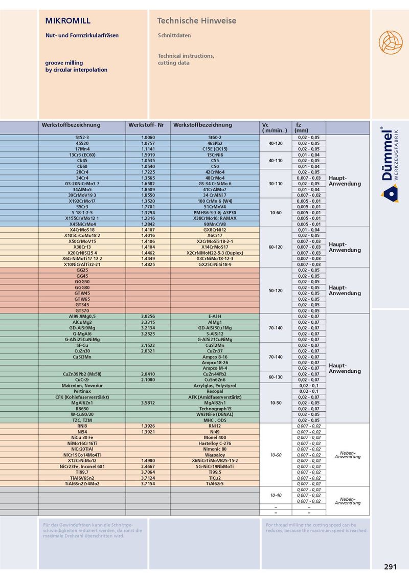 MIKROMILL Technische Hinweise Nut- und Formzirkularfräsen Schnittdaten Technical instructions, groove milling cutting data by circular interpolation Werkstoff Festigkeit Werkstoff-Nr Werkstoffbezeichnung Werkstoff-Nr Werkstoffbezeichnung Werkstoff- Nr Werkstoffbezeichnung Vc fz ( m/min. ) (mm) Allgemeiner Baustahl < 800 N/mm2 1.0037 St37-2 1.0570 St52-3 1.0060 St60-2 0,02 - 0,05 Automatenstahl < 800 N/mm2 1.0718 9SMnPb28 1.0727 45S20 1.0757 46SPb2 40-120 0,02 - 0,05 Einsatzstahl unlegiert < 800 N/mm2 1.0401 C15 1.0481 17Mn4 1.1141 C15E (CK15) 0,02 - 0,05 Einsatzstahl legiert < 1000 N/mm2 1.7331 16MnCr5 (EC80) 1.7015 13Cr3 (EC60) 1.5919 15CrNi6 0,01 - 0,04 Vergütungsstahl unlegiert < 850 N/mm2 1.0503 C45 1.1191 Ck45 1.0535 C55 40-110 0,02 - 0,05 Vergütungsstahl unlegiert < 1000 N/mm2 1.0601 C60 1.1221 Ck60 1.0540 C50 0,01 - 0,04 Vergütungsstahl legiert < 800 N/mm2 1.5131 50MnSi4 1.7030 28Cr4 1.7225 42CrMo4 0,02 - 0,05 Vergütungsstahl legiert < 1300 N/mm2 1.5755 31NiCr14 1.7033 34Cr4 1.3565 48CrMo4 0,007 - 0,03 Haupt- P Stahlguss < 850 N/mm2 0.9650 G-X260Cr27 1.6750 GS-20NiCrMo3 7 1.6582 GS-34 CrNiMo 6 30-110 0,02 - 0,05 Anwendung Nitrierstahl < 1000 N/mm2 1.8504 34CrAl6 1.8507 34AlMo5 1.8509 41CrAlMo7 0,01 - 0,04 Nitrierstahl < 1200 N/mm2 1.8515 31CrMo12 1.8523 39CrMoV19 3 1.8550 34 CrAlNi 7 0,007 - 0,02 Wälzlagerstahl < 1200 N/mm2 1.3505 100Cr6 (W3) 1.3543 X192CrMo17 1.3520 100 CrMn 6 (W4) 0,005 - 0,01 Federstahl < 1200 N/mm2 1.5026 55Si7 1.7176 55Cr3 1.7701 51CrMoV4 0,005 - 0,01 Schnellarbeitsstahl < 1300 N/mm2 1.3344 S 6-5-3 1.3255 S 18-1-2-5 1.3294 PMHS6-5-3-8; ASP30 10-60 0,005 - 0,01 Werkzeugstahl für Kaltarbeit < 1300 N/mm2 1.2312 40CrMnMoS8 6 1.2379 X155CrVMo12 1 1.2316 X38CrMo16; RAMAX 0,005 - 0,01 Werkzeugstahl für Warmbeit < 1300 N/mm2 1.2343 X38CrMoV 5 1 1.2767 X45NiCrMo4 1.2842 90MnCrV8 0,005 - 0,01 Stahl und Stahlguss rostfei geschwefelt < 850 N/mm2 1.4305 X8CrNiS18 9 1.4105 X4CrMoS18 1.4107 GX8CrNi12 0,01 - 0,04 Nichtrostender Stahl, ferritisch < 750 N/mm2 1.4510 X3CrTi17 1.4528 X105CrCoMo18 2 1.4016 X6Cr17 0,02 - 0,05 Nichtrostender Stahl, martensitisch < 900 N/mm2 1.4034 X46Cr13 1.4116 X50CrMoV15 1.4106 X2CrMoSiS18-2-1 0,007 - 0,03 Haupt- M Nichtrost. Stahl, ferritisch/martensit. <1100 N/mm2 1.4313 X3CrNi13-4 1.4028 X30Cr13 1.4104 X14CrMoS17 60-120 0,007 - 0,03 Anwendung Nichtrost. Stahl, austenitisch/ferritisch < 850 N/mm2 1.4460 X8CrNiMo27 5 1.4821 X20CrNiSi25 4 1.4462 X2CrNiMoN22-5-3 (Duplex) 0,007 - 0,03 Nichtrostender Stahl, austenitisch < 750 N/mm2 1.4301 X5CrNi18-10 1.4571 X6CrNiMoTi17 12 2 1.4449 X3CrNiMo18-12-3 0,007 - 0,03 Hitzebeständig < 1100 N/mm2 1.4747 X80CrNiSi20 1.4876 X10NiCrAlTi32-21 1.4825 GX25CrNiSi18-9 0,007 - 0,03 Grauguss mit Lammellengraphit 100-350N/mm2 0.6010 GG10 0.6025 GG25 0,02 - 0,05 Grauguss mit Lammellengraphit 300-1000N/mm2 0.6030 GG30 0.6045 GG45 0,02 - 0,05 Kugelgraphitguss 300-500N/mm2 0.7040 GGG40 0.7050 GGG50 0,02 - 0,05 Kugelgraphitguss 550-800N/mm2 0.7060 GGG60 0.7080 GGG80 0,02 - 0,05 Haupt- K 50-120 Temperguss weis 350-450N/mm2 0.8035 GTW35 0.8045 GTW45 0,02 - 0,05 Anwendung Temperguss weis 500-650N/mm2 0.8055 GTW55 0.8065 GTW65 0,02 - 0,05 Temperguss schwarz 350-450N/mm2 0.8135 GTS35 0.8145 GTS45 0,02 - 0,05 Temperguss schwarz 500-700N/mm2 0.8155 GTS55 0.8170 GTS70 0,02 - 0,05 Aluminium ( unlegiert, niedrig legiert ) < 350 N/mm2 3.0255 Al99,5 3.3308 Al99,9Mg0,5 3.0256 E-Al H 0,02 - 0,07 Aluminiumlegierungen < 0,5% Si < 500 N/mm2 3.0515 AlMn1 3.1355 AlCuMg2 3.3315 AlMg1 0,02 - 0,07 Aluminiumlegierungen 0,5-10% Si < 400 N/mm2 3.2152 GD-AlSi6Cu4 3.2373 GD-AlSi9Mg 3.2134 GD-AlSi5Cu1Mg 70-140 0,02 - 0,07 Aluminiumlegierungen 10-15% Si < 400 N/mm2 3.2381 G-AlSi10Mg 3.5562 G-MgAl6 3.2525 S-AlSi12 0,02 - 0,07 Aluminiumlegierungen > 15% Si < 400 N/mm2 G-AlSi17Cu4 G-AlSi25CuNiMg G-AlSi21CuNiMg 0,02 - 0,07 Kupfer ( unlegiert, niedrig legiert ) < 350 N/mm2 2.0060 E-Cu57 2.0090 SF-Cu 2.1522 CuSl2Mn 0,02 - 0,07 Kupfer-Knetlegierungen < 700 N/mm2 2.0240 CuZn15 2.0265 CuZn30 2.0321 CuZn37 0,02 - 0,07 Kupfer-Sonderlegierungen < 200 HB 2.0916 CuAl5 2.1525 CuSi3Mn Ampco 8-16 70-140 0,02 - 0,07 Kupfer-Sonderlegierungen < 300HB 2.0978 CuAl11Ni6Fe5 Ampco18-26 0,02 - 0,07 Haupt- N Kupfer-Sonderlegierungen > 300 HB 2.1247 CuBe2F125 Ampco M-4 0,02 - 0,07 Anwendung Messing kurzspanend, Bronze, Rotguss < 600 N/mm2 2.0360 CuZn40 (Ms60) 2.0380 CuZn39Pb2 (Ms58) 2.0410 CuZn44Pb2 0,02 - 0,07 60-130 Messing langspanend < 600 N/mm2 2.0335 CuZn36 (Ms63) 2.1293 CuCrZr 2.1080 CuSn6Zn6 0,02 - 0,07 Thermoplaste Delrin, Hostalen Makrolon, Novodur Acrylglas, Polystyrol 0,02 - 0,1 Duroplaste Ferrozell, Bakelit Pertinax Resopal 0,02 - 0,1 Faserverstärkte Kunststoffe GFK (Glasfaserverstärkt ) CFK (Kohlefaserverstärkt) AFK (Amidfaserverstärkt) 0,02 - 0,07 Magnesium und Magnesiumlegierungen < 850 N/mm2 3.5200 M2, MgMn2 3.5612 MgAl6Zn1 3.5812 MgAl8Zn1 10-50 0,02 - 0,05 Graphit C8000, R8500X R8650 Technograph15 0,02 - 0,07 Wolfram und Wolframlegierungen W-NiFe (Densimet W) W-Cu80/20 W93NiFe (DENAL) 0,02 - 0,05 Molybdän und Molybdänlegierungen Mo , Mo-50Re TZC, TZM MHC , ODS 0,02 - 0,05 Reinnickel 1.3911 RNi24 1.3927 RNi8 1.3926 RNi12 0,007 - 0,02 Nickellegierungen 1.3912 Ni36 (Invar) 1.3924 Ni54 1.3921 Ni49 0,007 - 0,02 Nickellegierungen < 850 N/mm2 2.4360 S-NiCu 30 Fe NiCu 30 Fe Monel 400 0,007 - 0,02 Nickel-Chromlegierungen 2.4886 SG-NiMo16Cr16W 2.4610 NiMo16Cr16Ti Hastelloy C-276 0,007 - 0,02 Nickel- und Kobaltlegierungen < 1300 N/mm2 2.4632 NiCr20Co18Ti 2.4631 NiCr20TiAl Nimonic 80 0,007 - 0,02 S Nickel- und Kobaltlegierungen < 1300 N/mm2 2.4634 NiCo20Cr15MoAlTi 2.4654 NiCr19Co14Mo4Ti Waspaloy 10-60 0,007 - 0,02 Neben- Anwendung Hochwarmfeste Legierungen < 1300 N/mm2 Hardox 400 1.4939 X12CrNiMo12 1.4980 X6NiCrTiMoVB25-15-2 0,007 - 0,02 Nickel-Kobalt-(Chrom-)legierungen < 1400 N/mm2 2.4806 SG-NiCr20Nb, Inconel 82 2.4851 NiCr23Fe, Inconel 601 2.4667 SG-NiCr19NbMoTi 0,007 - 0,02 Reintitan < 900 N/mm2 3.7025 Ti99,8 3.7034 Ti99,7 3.7064 Ti99,5 0,007 - 0,02 Titan