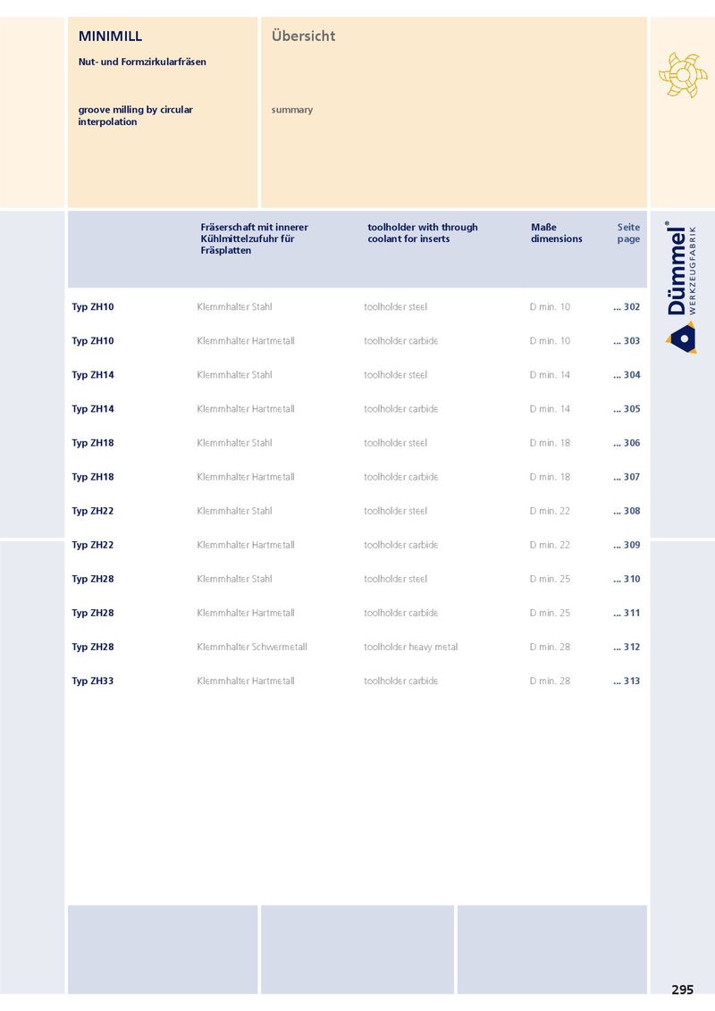 MINIMILL Übersicht Nut- und Formzirkularfräsen groove milling by circular summary interpolation Fräserschaft mit innerer toolholder with through Maße Seite Kühlmittelzufuhr für coolant for inserts dimensions page Fräsplatten Typ ZH10 Klemmhalter Stahl toolholder steel D min. 10 ... 302 Typ ZH10 Klemmhalter Hartmetall toolholder carbide D min. 10 ... 303 Typ ZH14 Klemmhalter Stahl toolholder steel D min. 14 ... 304 Typ ZH14 Klemmhalter Hartmetall toolholder carbide D min. 14 ... 305 Typ ZH18 Klemmhalter Stahl toolholder steel D min. 18 ... 306 Typ ZH18 Klemmhalter Hartmetall toolholder carbide D min. 18 ... 307 Typ ZH22 Klemmhalter Stahl toolholder steel D min. 22 ... 308 Typ ZH22 Klemmhalter Hartmetall toolholder carbide D min. 22 ... 309 Typ ZH28 Klemmhalter Stahl toolholder steel D min. 25 ... 310 Typ ZH28 Klemmhalter Hartmetall toolholder carbide D min. 25 ... 311 Typ ZH28 Klemmhalter Schwermetall toolholder heavy metal D min. 28 ... 312 Typ ZH33 Klemmhalter Hartmetall toolholder carbide D min. 28 ... 313 295