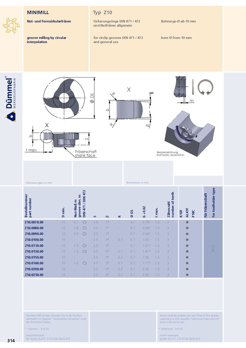 MINIMILL Typ Z10 Nut- und Formzirkularfräsen Sicherungsringe DIN 471 / 472 Bohrungs-Ø ab 10 mm und Nutfräsen allgemein groove milling by circular for circlip grooves DIN 471 / 472 bore Ø from 10 mm interpolation and general use X R β DS m b X R β b S t max. Fräserschaft Beispielzeichnung shank face exemplary application Abmessungen in mm dimensions in mm Bestellnummer part number D min. Nut-Maß m groove dim. m DIN 471 / DIN 472 S β R Ø DS b +0.02 t max. Zähnezahl number of teeth K10F AL41F P18C für Fräserschaft for toolholder type Z10.0070.00 10 0.7 3.5 1° - 9.7 0.74* 1.5 3 ˜ Z10.0080.00 10 0.8 3.5 1° - 9.7 0.84* 1.5 3 ˜ Z10.0090.00 10 0.9 3.5 1° - 9.7 0.94* 1.5 3 ˜ Z10.0100.00 10 - - 3.5 3° 0.1 9.7 1.00 1.5 3 ˜ Z10.0110.00 10 1.1 3.5 3° - 9.7 1.21* 1.5 3 ˜ Z10.0130.00 10 1.3 3.5 3° 0.1 9.7 1.41* 1.5 3 ˜ ZH10 Z10.0150.00 10 - - 3.5 3° 0.2 9.7 1.50 1.5 3 ˜ Z10.0160.00 10 1.6 3.5 3° 0.1 9.7 1.71* 1.5 3 ˜ Z10.0200.00 10 - - 3.5 3° 0.2 9.7 2.00 1.5 3 ˜ Z10.0250.00 10 - - 3.5 3° 0.2 9.7 2.50 1.5 3 ˜ Weitere HM Sorten können Sie in der Sorten- More carbide grades you can find in the grades übersicht im Kapitel "Technische Hinweise" und summary in the chapter "technical instructions" der Preisliste finden. and in the price list. * Toleranz : b-0.02 * tolerance: b-0.02 Bestellbeispiel: order-example: für Sorte AL41F: Z10.0160.00/AL41F grade AL41F: Z10.0160.00/AL41F 314