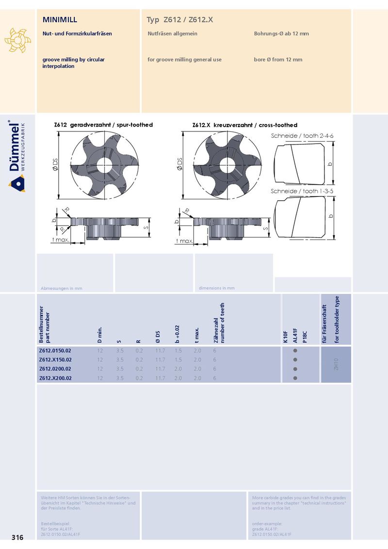 MINIMILL Typ Z612 / Z612.X Nut- und Formzirkularfräsen Nutfräsen allgemein Bohrungs-Ø ab 12 mm groove milling by circular for groove milling general use bore Ø from 12 mm interpolation Z612 geradverzahnt / spur-toothed Z612.X kreuzverzahnt / cross-toothed Schneide / tooth 2-4-6 DS DS b Schneide / tooth 1-3-5 R R b b b S R S t max. t max. Abmessungen in mm dimensions in mm Bestellnummer part number D min. S R Ø DS b +0.02 t max. Zähnezahl number of teeth K10F AL41F P18C für Fräserschaft for toolholder type Z612.0150.02 12 3.5 0.2 11.7 1.5 2.0 6 ˜ Z612.X150.02 12 3.5 0.2 11.7 1.5 2.0 6 ˜ Z612.0200.02 12 3.5 0.2 11.7 2.0 2.0 6 ˜ ZH10 Z612.X200.02 12 3.5 0.2 11.7 2.0 2.0 6 ˜ Weitere HM Sorten können Sie in der Sorten- More carbide grades you can find in the grades übersicht im Kapitel "Technische Hinweise" und summary in the chapter "technical instructions" der Preisliste finden. and in the price list. Bestellbeispiel: order-example: für Sorte AL41F: grade AL41F: Z612.0150.02/AL41F Z612.0150.02/AL41F 316