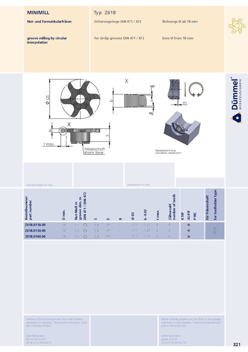 MINIMILL Typ Z618 Nut- und Formzirkularfräsen Sicherungsringe DIN 471 / 472 Bohrungs-Ø ab 18 mm groove milling by circular for circlip grooves DIN 471 / 472 bore Ø from 18 mm interpolation X E DS b m E X b S t max. Fräserschaft Beispielzeichnung shank face exemplary application Abmessungen in mm dimensions in mm Bestellnummer part number D min. Nut-Maß m groove dim. m DIN 471 / DIN 472 S β R Ø DS b -0.02 t max. Zähnezahl number of teeth K10F AL41F P18C für Fräserschaft for toolholder type Z618.0110.00 18 1.1 5.8 3° - 17.7 1.21 4 6 ˜ Z618.0130.00 18 1.3 5.8 3° - 17.7 1.41 4 6 ˜ ZH18 Z618.0160.00 18 1.6 5.8 3° - 17.7 1.71 4 6 ˜ Weitere HM Sorten können Sie in der Sorten- More carbide grades you can find in the grades übersicht im Kapitel "Technische Hinweise" und summary in the chapter "technical instructions" der Preisliste finden. and in the price list. Bestellbeispiel: order-example: für Sorte AL41F: grade AL41F: Z618.0110.00/AL41F Z618.0110.00/AL41F 321
