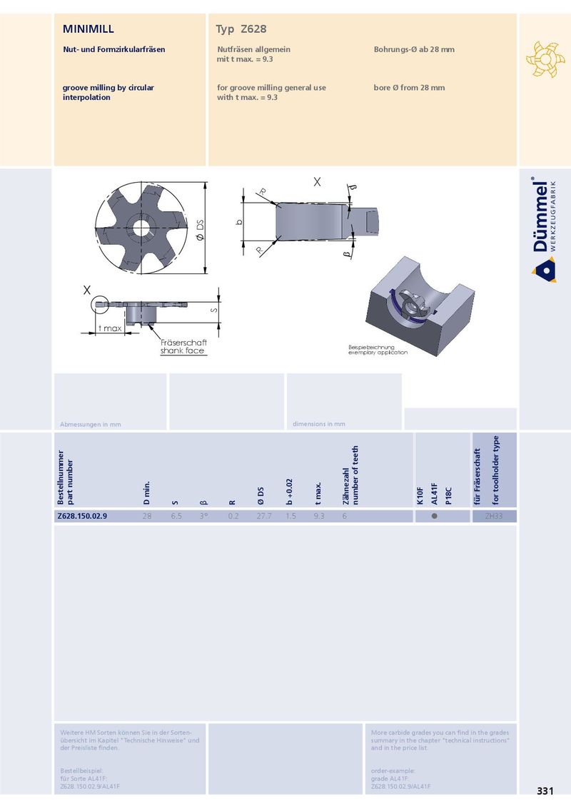 MINIMILL Typ Z628 Nut- und Formzirkularfräsen Nutfräsen allgemein Bohrungs-Ø ab 28 mm mit t max. = 9.3 groove milling by circular for groove milling general use bore Ø from 28 mm interpolation with t max. = 9.3 X E R b DS R E X S t max Fräserschaft Beispielzeichnung shank face exemplary application Abmessungen in mm dimensions in mm Bestellnummer part number D min. S β R Ø DS b +0.02 t max. Zähnezahl number of teeth K10F AL41F P18C für Fräserschaft for toolholder type Z628.150.02.9 28 6.5 3° 0.2 27.7 1.5 9.3 6 ˜ ZH33 Weitere HM Sorten können Sie in der Sorten- More carbide grades you can find in the grades übersicht im Kapitel "Technische Hinweise" und summary in the chapter "technical instructions" der Preisliste finden. and in the price list. Bestellbeispiel: order-example: für Sorte AL41F: grade AL41F: Z628.150.02.9/AL41F Z628.150.02.9/AL41F 331
