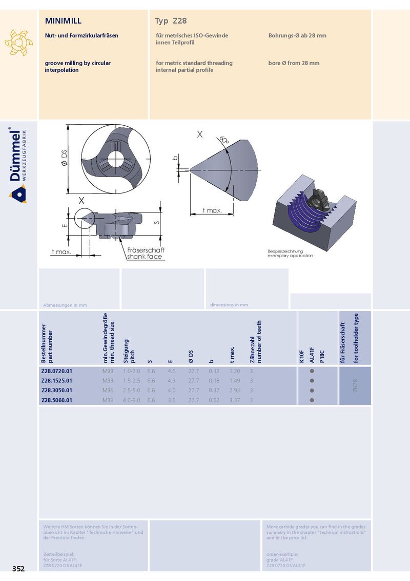 MINIMILL Typ Z28 Nut- und Formzirkularfräsen für metrisches ISO-Gewinde Bohrungs-Ø ab 28 mm innen Teilprofil groove milling by circular for metric standard threading bore Ø from 28 mm interpolation internal partial profile X 60° DS b X t max. S E t max. Fräserschaft Beispielzeichnung shank face exemplary application Abmessungen in mm dimensions in mm Bestellnummer part number min.Gewindegröße min. thread size Steigung pitch S E Ø DS b t max. Zähnezahl number of teeth K10F AL41F P18C für Fräserschaft for toolholder type Z28.0720.01 M33 1.0-2.0 6.6 4.6 27.7 0.12 1.20 3 ˜ Z28.1525.01 M33 1.5-2.5 6.6 4.3 27.7 0.18 1.49 3 ˜ Z28.3050.01 M36 2.5-5.0 6.6 4.0 27.7 0.37 2.93 3 ˜ ZH28 Z28.5060.01 M39 4.0-6.0 6.6 3.6 27.7 0.62 3.37 3 ˜ Weitere HM Sorten können Sie in der Sorten- More carbide grades you can find in the grades übersicht im Kapitel "Technische Hinweise" und summary in the chapter "technical instructions" der Preisliste finden. and in the price list. Bestellbeispiel: order-example: für Sorte AL41F: grade AL41F: Z28.0720.01/AL41F Z28.0720.01/AL41F 352