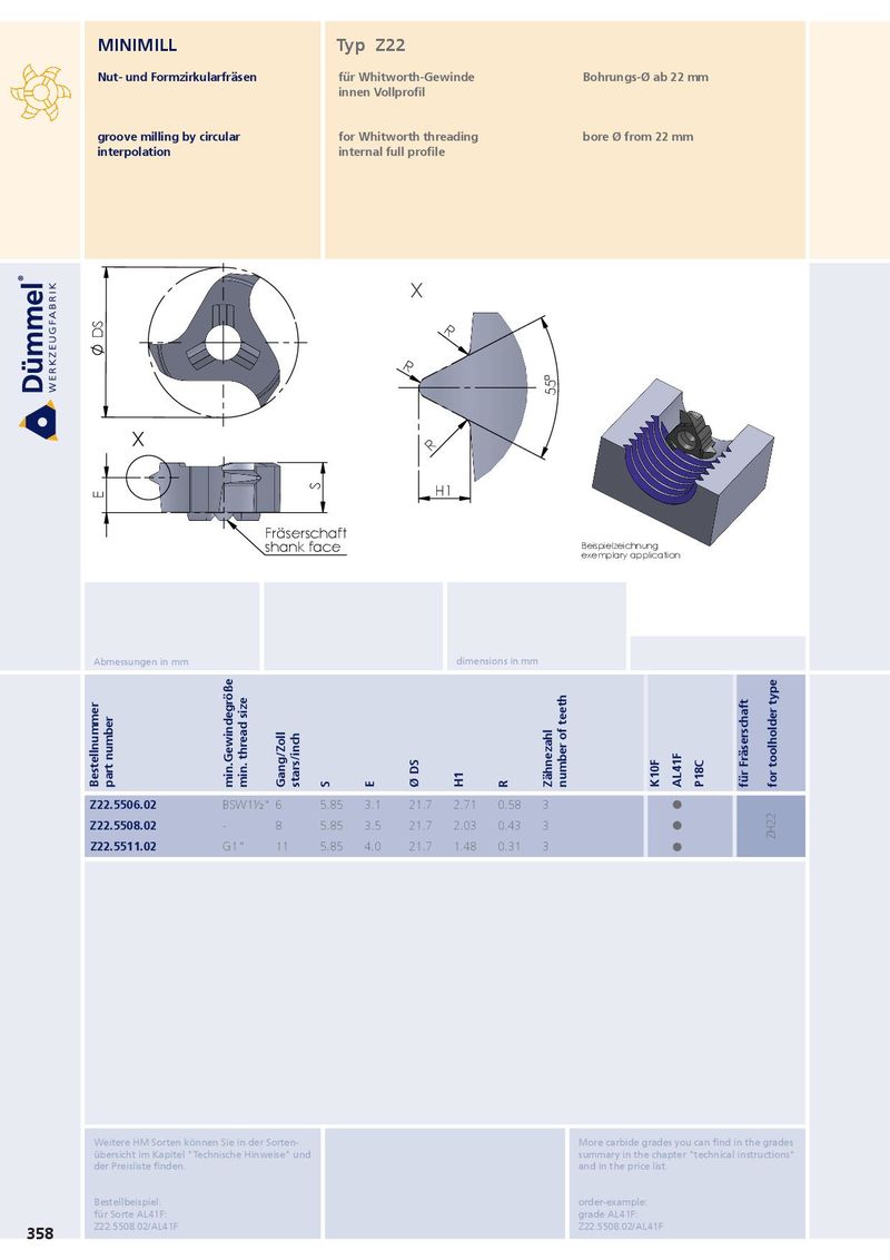 MINIMILL Typ Z22 Nut- und Formzirkularfräsen für Whitworth-Gewinde Bohrungs-Ø ab 22 mm innen Vollprofil groove milling by circular for Whitworth threading bore Ø from 22 mm interpolation internal full profile X R DS R 55° X R S H1 E Fräserschaft shank face Beispielzeichnung exemplary application Abmessungen in mm dimensions in mm Bestellnummer part number min.Gewindegröße min. thread size Gang/Zoll stars/inch S E Ø DS H1 R Zähnezahl number of teeth K10F AL41F P18C für Fräserschaft for toolholder type Z22.5506.02 BSW1½" 6 5.85 3.1 21.7 2.71 0.58 3 ˜ Z22.5508.02 - 8 5.85 3.5 21.7 2.03 0.43 3 ˜ ZH22 Z22.5511.02 G1" 11 5.85 4.0 21.7 1.48 0.31 3 ˜ Weitere HM Sorten können Sie in der Sorten- More carbide grades you can find in the grades übersicht im Kapitel "Technische Hinweise" und summary in the chapter "technical instructions" der Preisliste finden. and in the price list. Bestellbeispiel: order-example: für Sorte AL41F: grade AL41F: Z22.5508.02/AL41F Z22.5508.02/AL41F 358