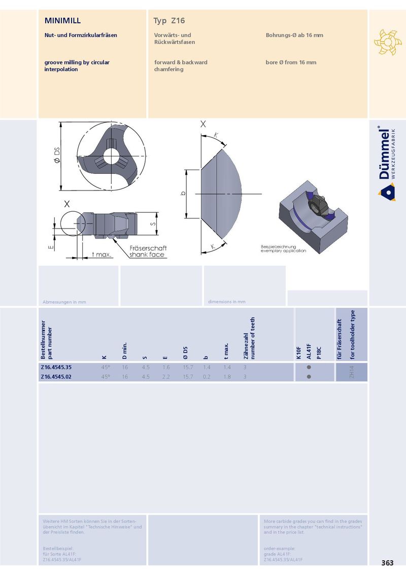 MINIMILL Typ Z16 Nut- und Formzirkularfräsen Vorwärts- und Bohrungs-Ø ab 16 mm Rückwärtsfasen groove milling by circular forward & backward bore Ø from 16 mm interpolation chamfering X K DS b X S Beispielzeichnung E Fräserschaft K exemplary application t max. shank face Abmessungen in mm dimensions in mm Bestellnummer part number K D min. S E Ø DS b t max. Zähnezahl number of teeth K10F AL41F P18C für Fräserschaft for toolholder type Z16.4545.35 45° 16 4.5 1.6 15.7 1.4 1.4 3 ˜ Z16.4545.02 45° 16 4.5 2.2 15.7 0.2 1.8 3 ˜ ZH14 Weitere HM Sorten können Sie in der Sorten- More carbide grades you can find in the grades übersicht im Kapitel "Technische Hinweise" und summary in the chapter "technical instructions" der Preisliste finden. and in the price list. Bestellbeispiel: order-example: für Sorte AL41F: grade AL41F: Z16.4545.35/AL41F Z16.4545.35/AL41F 363