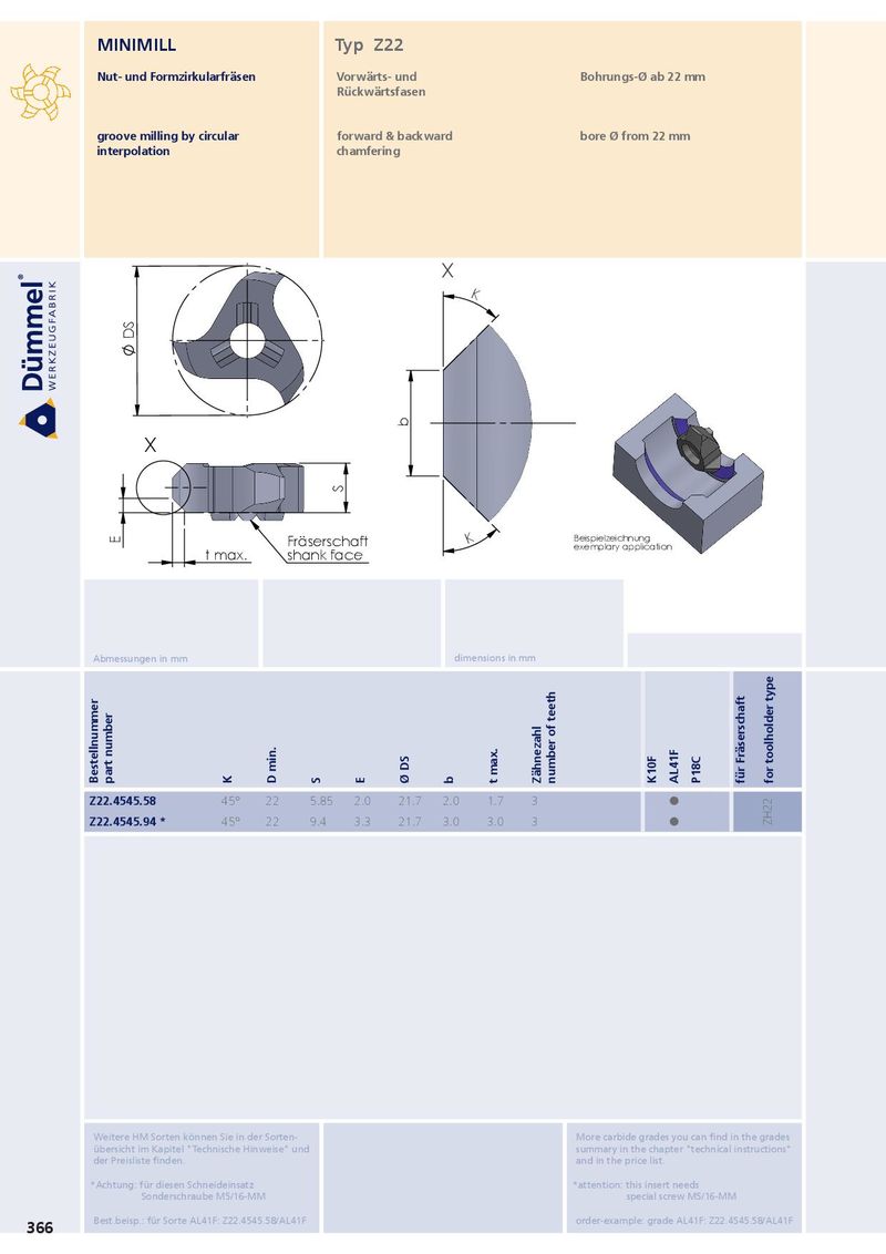MINIMILL Typ Z22 Nut- und Formzirkularfräsen Vorwärts- und Bohrungs-Ø ab 22 mm Rückwärtsfasen groove milling by circular forward & backward bore Ø from 22 mm interpolation chamfering X K DS b X S Beispielzeichnung E Fräserschaft K exemplary application t max. shank face Abmessungen in mm dimensions in mm Bestellnummer part number K D min. S E Ø DS b t max. Zähnezahl number of teeth K10F AL41F P18C für Fräserschaft for toolholder type Z22.4545.58 45° 22 5.85 2.0 21.7 2.0 1.7 3 ˜ Z22.4545.94 * 45° 22 9.4 3.3 21.7 3.0 3.0 3 ˜ ZH22 Weitere HM Sorten können Sie in der Sorten- More carbide grades you can find in the grades übersicht im Kapitel "Technische Hinweise" und summary in the chapter "technical instructions" der Preisliste finden. and in the price list. *Achtung: für diesen Schneideinsatz *attention: this insert needs Sonderschraube M5/16-MM special screw M5/16-MM Best.beisp.: für Sorte AL41F: Z22.4545.58/AL41F order-example: grade AL41F: Z22.4545.58/AL41F 366