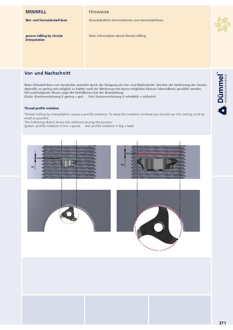 MINIMILL Hinweise Nut- und Formzirkularfräsen Grundsätzliche Informationen zum Gewindefräsen groove milling by circular Basic information about thread milling interpolation Vor- und Nachschnitt Beim Zirkularfräsen von Gewinden entsteht durch die Steigung ein Vor- und Nachschnitt. Um hier die Verletzung des Gewin- deprofils so gering wie möglich zu halten muß ein Werkzeug mit einem möglichst kleinen Schneidkreis gewählt werden. Die nachfolgende Skizze zeigt die Verhältnisse bei der Bearbeitung: (Grün: Konturverletzung X gering = gut; Rot: Konturverletzung X erheblich = schlecht) Thread profile violation Thread milling by interpolation causes a profile violation. To keep the violation minimal you should use the cutting circle as small as possible. The following sketch shows the relations during the process: (green: profile violation X low = good; red: profile violation X big = bad) x x 371